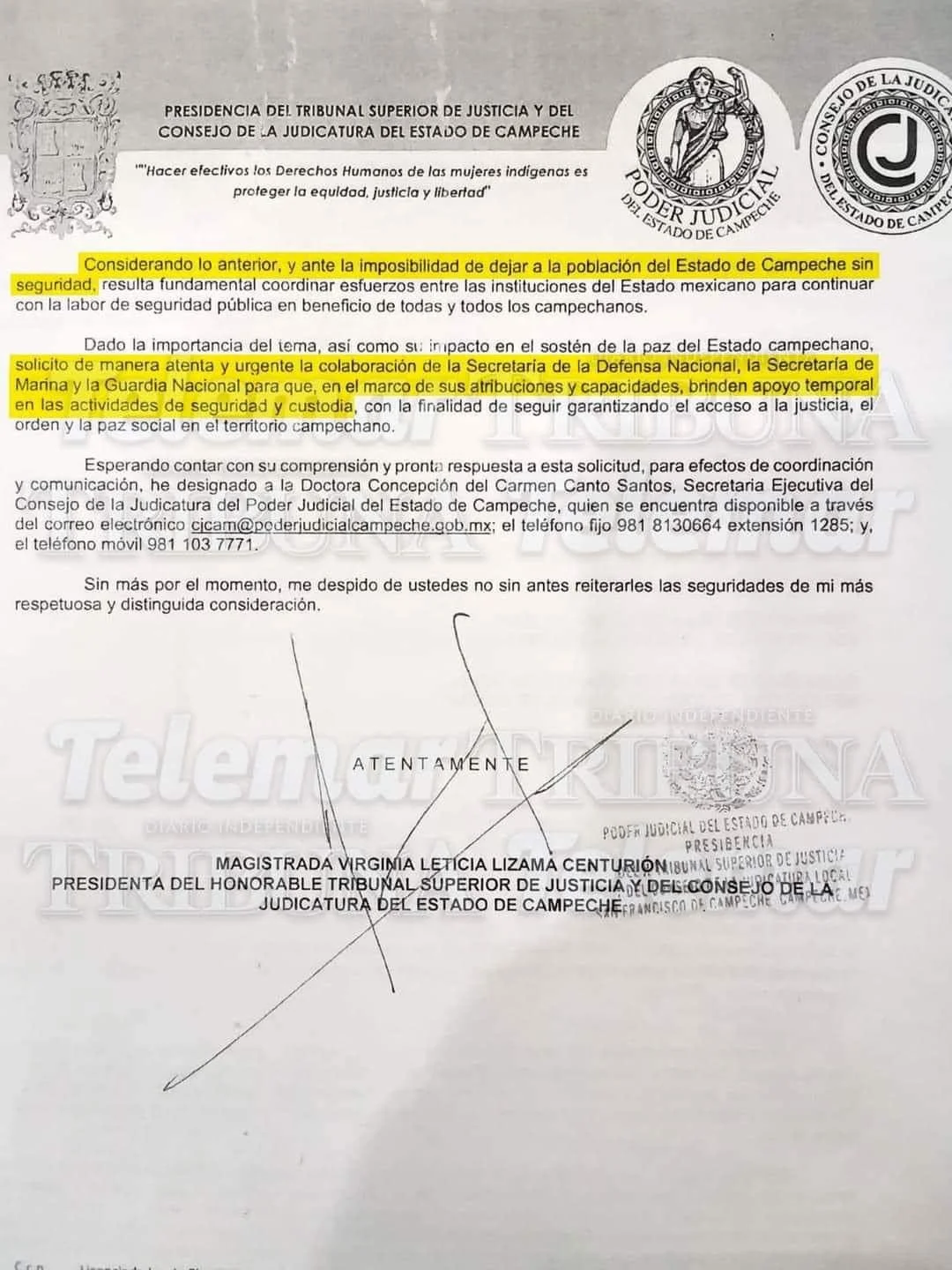 En dicho escrito marcado con el folio 2719/CJCAM/SEJEC-P/23-2024, dirigido a la Secretaría de Gobierno, la Secretaría de Protección y Seguridad Ciudadana (SPSJ), y la Fiscalía General del Estado de Campeche, Lizama Centurión justifica su petición debido a que los diversos hechos recientes ponen en riesgo el derecho de los campechanos a un acceso a la justicia y seguridad adecuados.