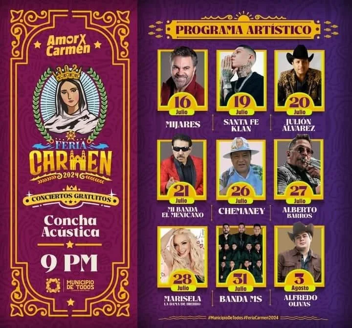 El día 27 de julio se tendrá la presentación de Alberto Barros, para que el 28, se presente en concierto Marisela; y finalmente para el cierre de la Feria Carmen 2024 se contará con la música de Banda MS y el último día, el 3 de agosto, estará Alfredo Olivas.