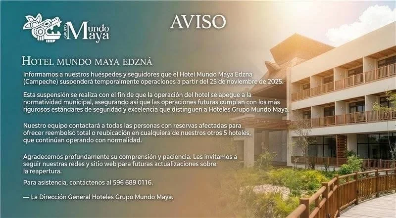 A través de redes sociales, el Grupo de Hoteles Mundo Maya anunció la suspensión temporal de las operaciones de su hotel en Edzná, Campeche, a partir de este martes 25 de noviembre de 2025, debido a que se apegarán a la normatividad municipal para cumplir con estándares de seguridad, los cuales no cumplieron desde su construcción y durante su puesta en marcha.