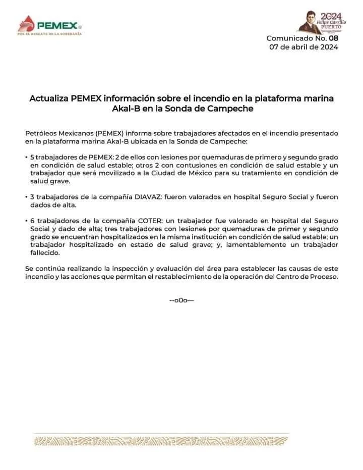 A través de un comunicado, Petróleos Mexicanos (Pemex) confirmó el número de trabajadores heridos y fallecidos tras el incendio presentado este domingo en la plataforma marina Akal-B ubicada en la Sonda de Campeche.