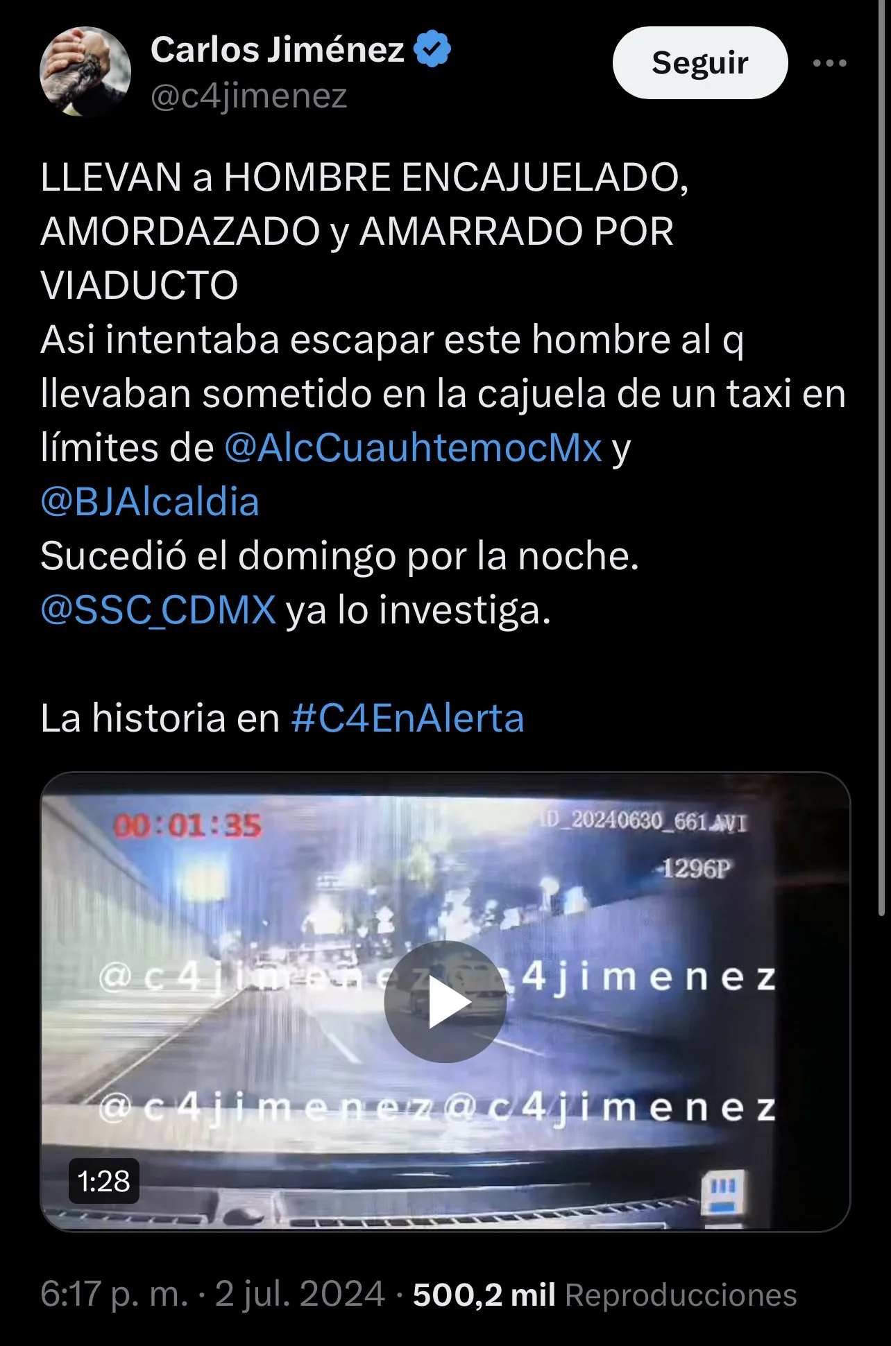 Cabe recordar, que el video compartido en redes fue grabado por otro automovilista que quedó detrás del vehículo donde el hombre amordazado trataba de salir de la cajuela a pesar de que el carro estaba en movimiento sobre una de las vías rápidas que conecta al poniente con el oriente de la Ciudad de México.
