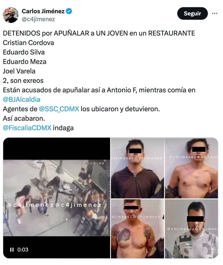Detienen a sujetos responsables de apuñalar a un joven en un restaurante de la CDMX