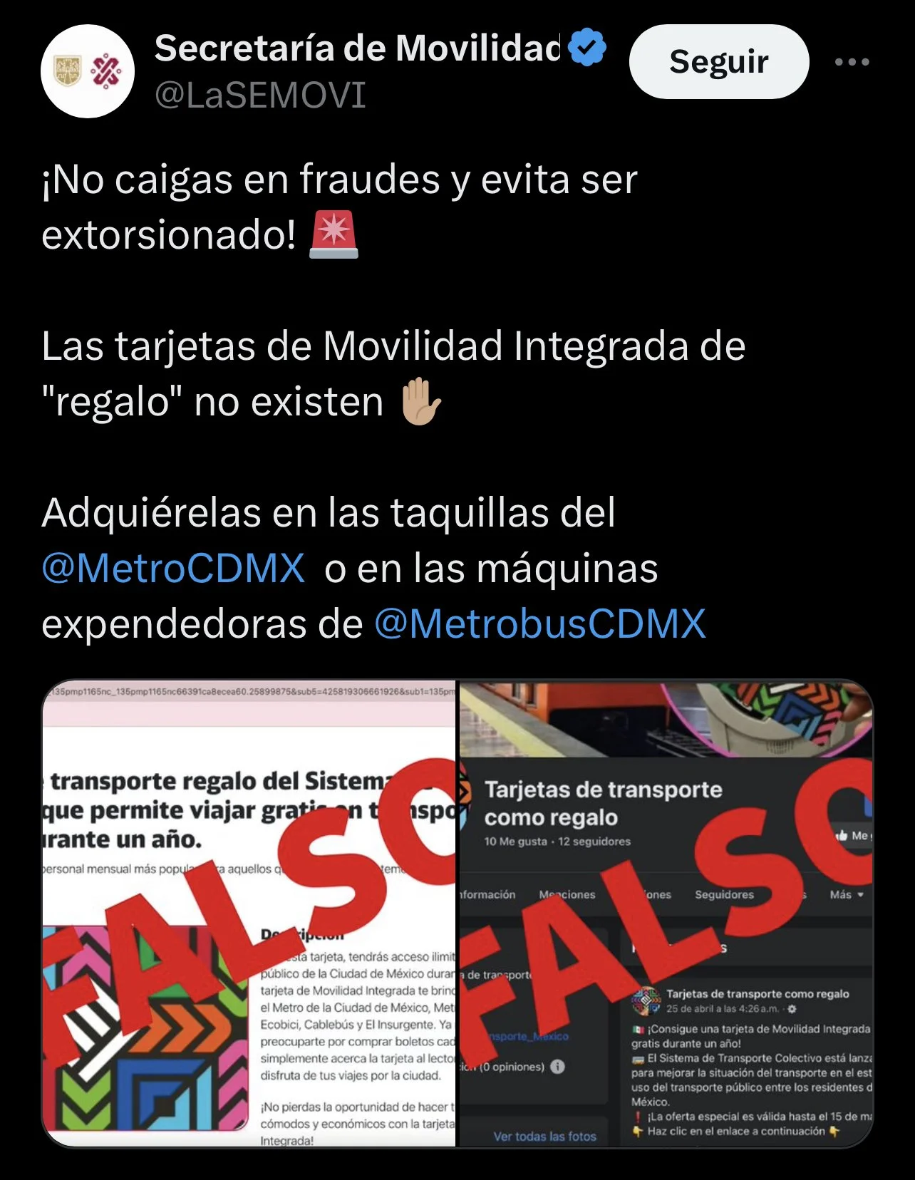 La Secretaría de Movilidad de la Ciudad de México (Semovi) indicó a través de su cuenta de X, que los anuncios en redes sociales sobre tarjetas de Movilidad Integrada (MI) gratuitas son falsos, por lo que hizo un llamado a la población para evitar caer víctimas de fraudes y extorsión.