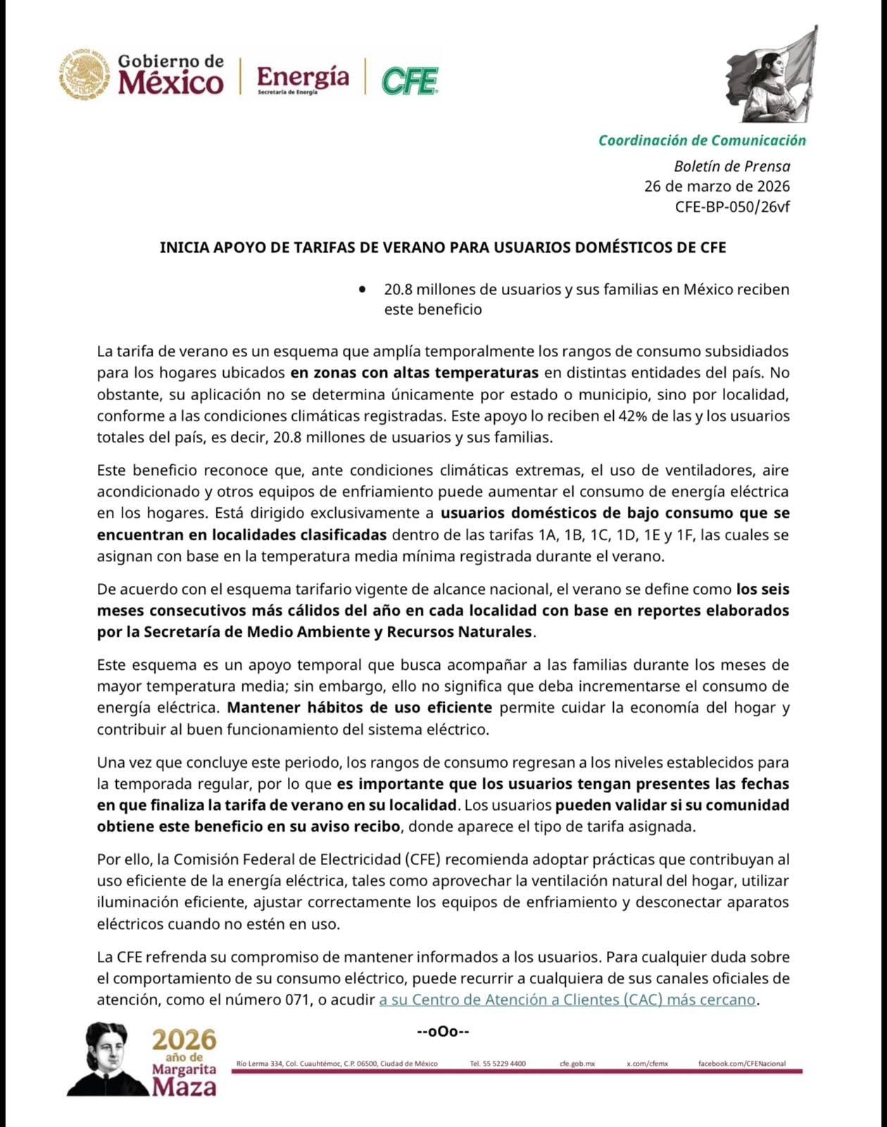 La Comisión Federal de Electricidad (CFE) activó el subsidio de la tarifa de verano 2026 desde el 26 de marzo, beneficio que aplica de forma automática a usuarios domésticos ubicados en localidades con temperaturas medias mínimas de 25 grados centígrados o más, lo que incluye a gran parte de los municipios de Chiapas.