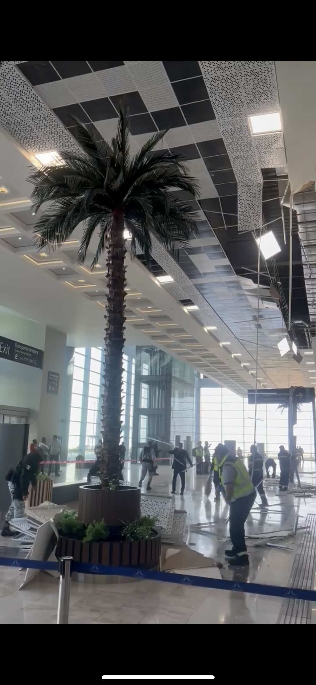 En el clip que circula, principalmente en X, antes Twitter, se observa una zona acordonada donde hay un enorme agujero y escombros colgando en las alturas del techo, mientras personal del AIFA recoge los escombros.