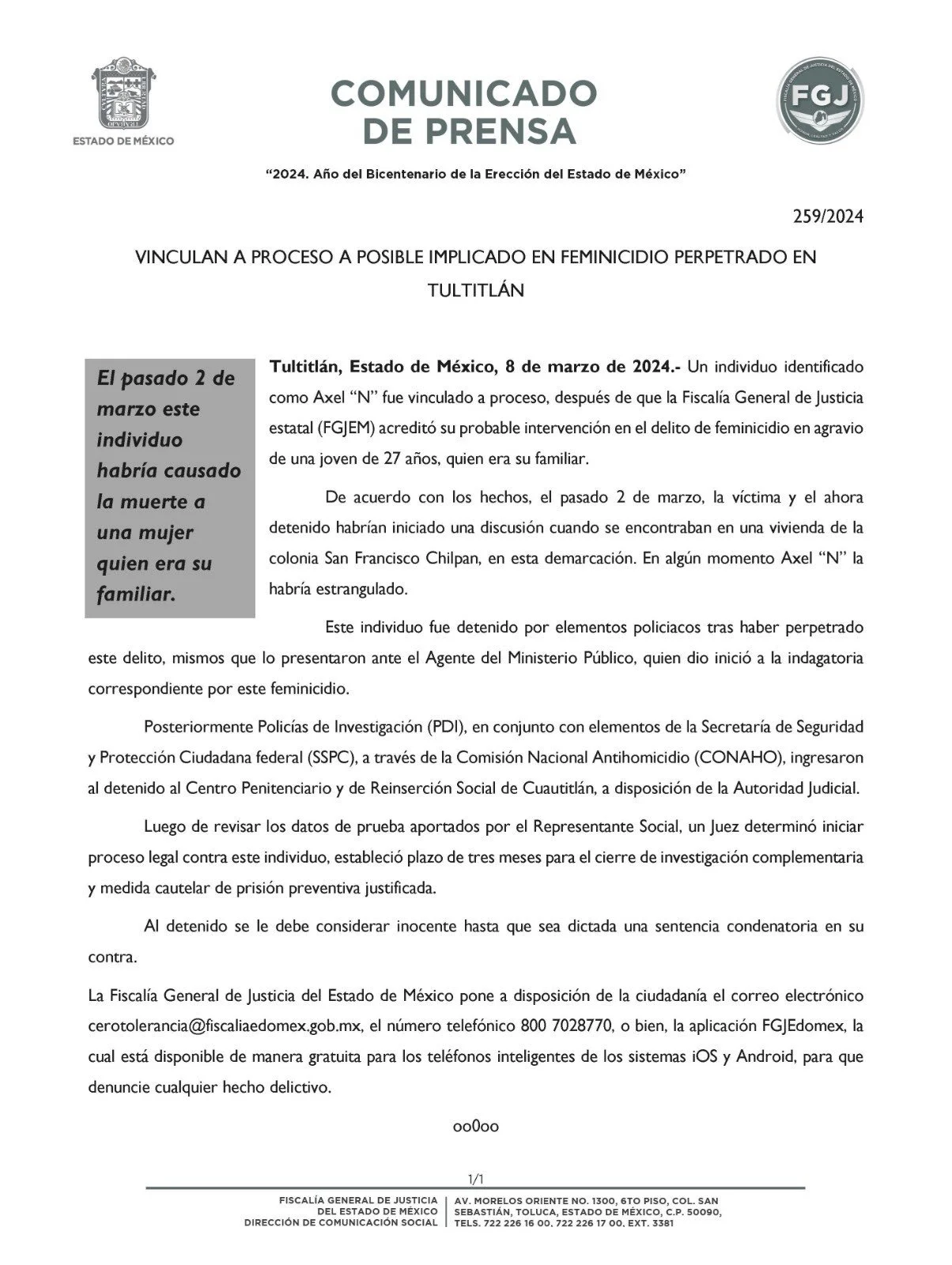 Tras ser capturado en el territorio municipal de Tultitlán, Axel “N” fue trasladado por agentes de la Policía estatal ante el agente del Ministerio Público, quien decidió internarlo provisionalmente, un plazo máximo de tres meses, en el penal de Cuautitlán por el delito de feminicidio.