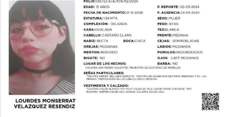La joven de 15 años fue vista por última vez en San Pedro Xalostoc, en Ecatepec, Estado de México, mide 1,54 metros, pesa 43 kilos y como señas particulares sus familiares señalan que tiene una cicatriz arriba del labio, de lado derecho.