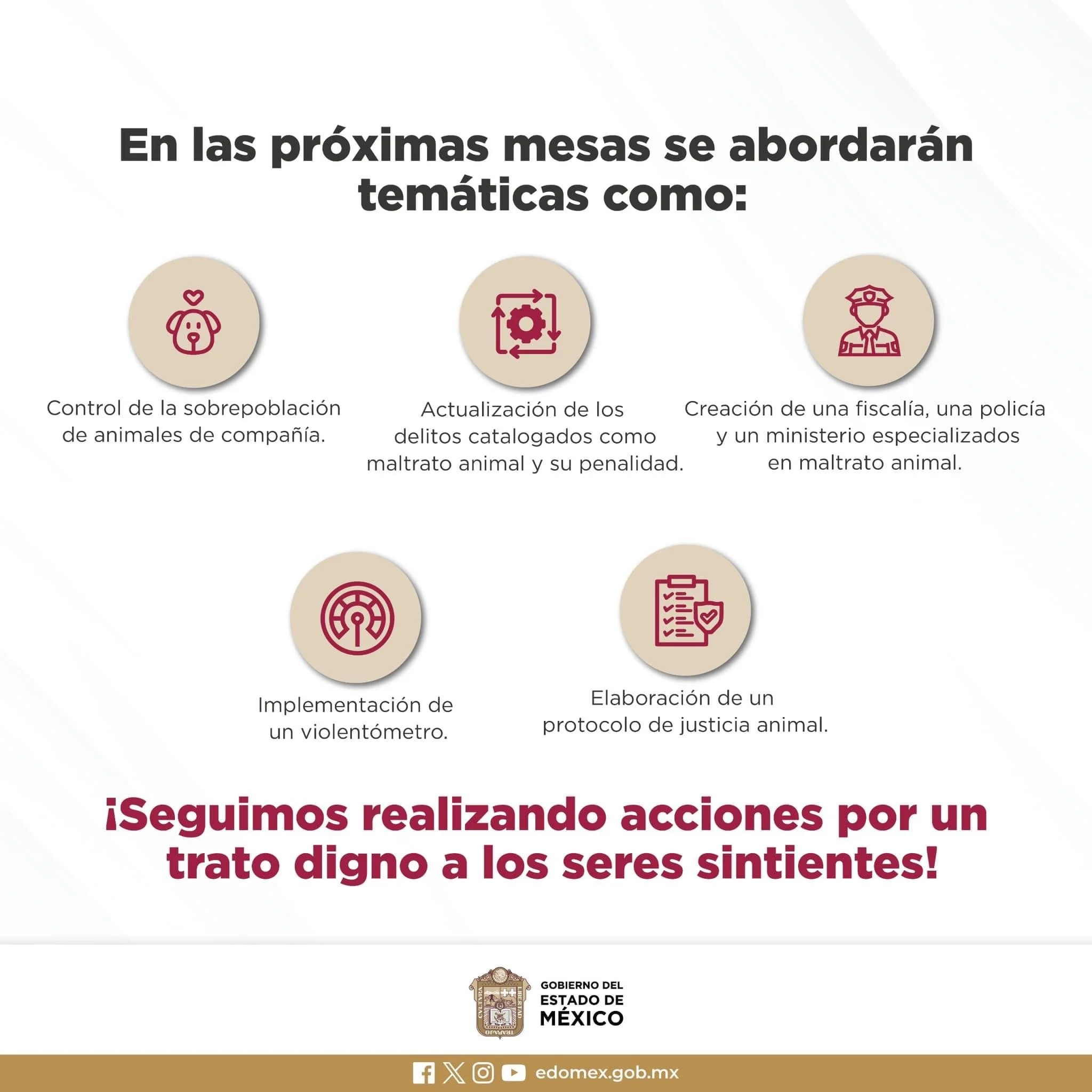 Las mesas de trabajo para la creación de estas reformas, se integrarán por representantes de los tres órdenes de gobierno, universidades, especialistas, y asociaciones civiles quienes propondrán al Congreso local, la creación de instrumentos de seguridad especializados en la materia, como: la Policía de Protección y Cuidado Animal, y una Fiscalía Especializada.