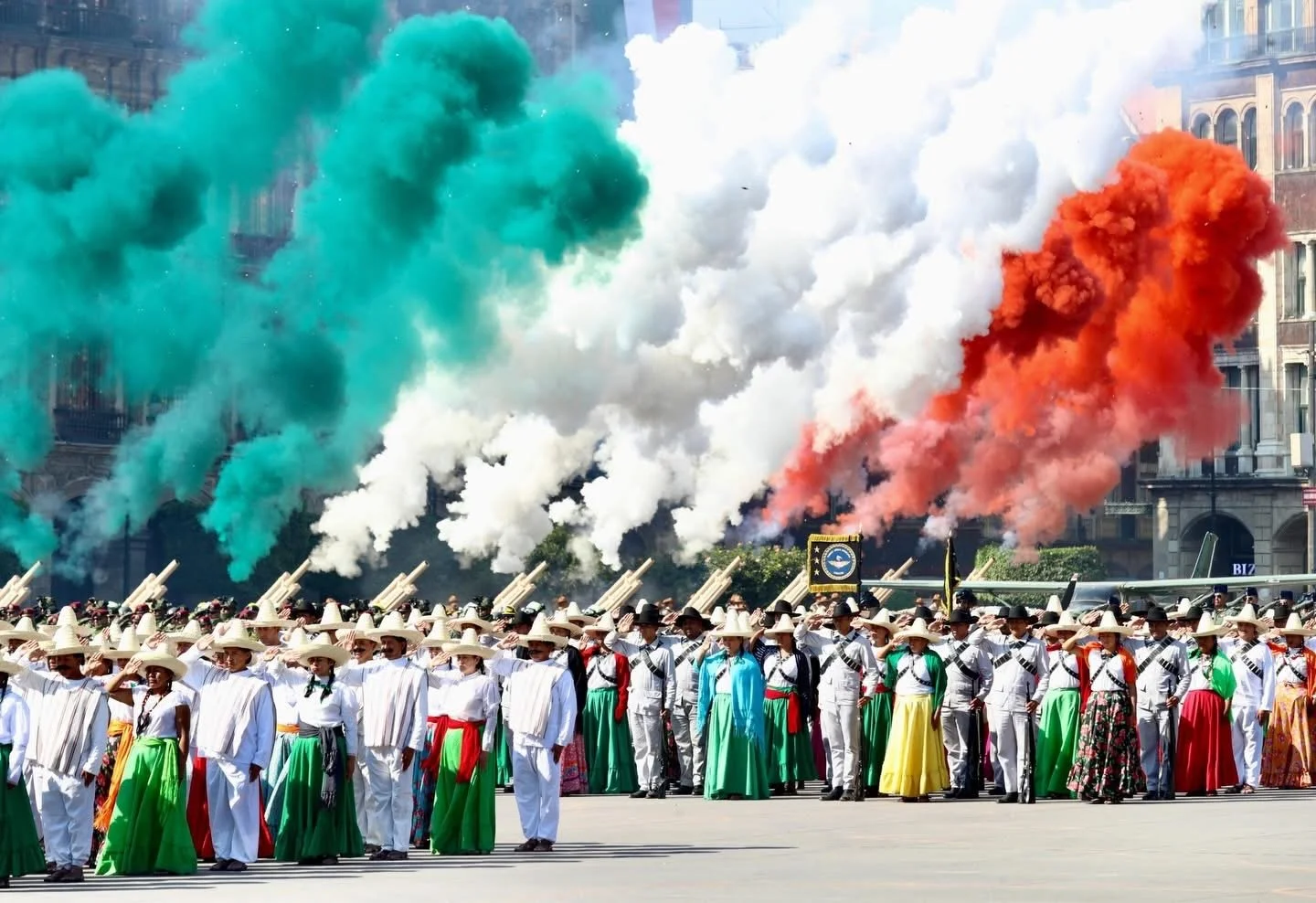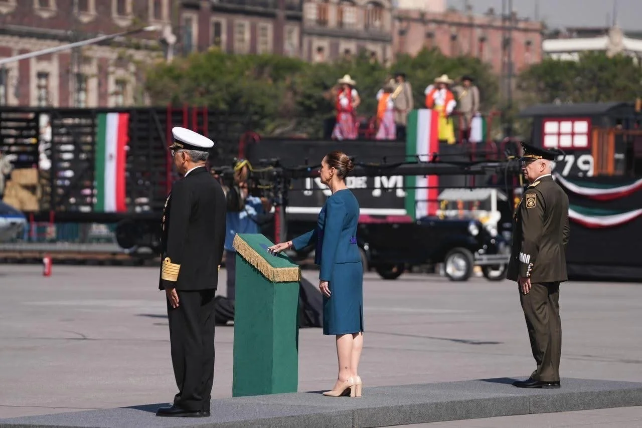 Mientras que los honores a la presidenta comenzaron a las 10:21 horas, quien estuvo acompañada por integrantes del Gabinete federal, autoridades militares y la jefa de Gobierno capitalina, Clara Brugada Molina. Luego de la ceremonia protocolaria, comenzó el pase de revista a los contingentes que participan en la parada militar para dar lugar al desfile miles de elementos de las Fuerzas Armadas, así como grupos que hicieron representaciones históricas.
