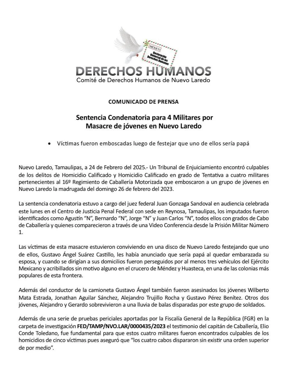 Un Tribunal de Enjuiciamiento declaró culpables de homicidio calificado y homicidio calificado en grado de tentativa a cuatro militares del 16º Regimiento de Caballería Motorizada, responsables de la emboscada contra un grupo de jóvenes en la madrugada del 26 de febrero del 2023 en Nuevo Laredo, Tamaulipas.