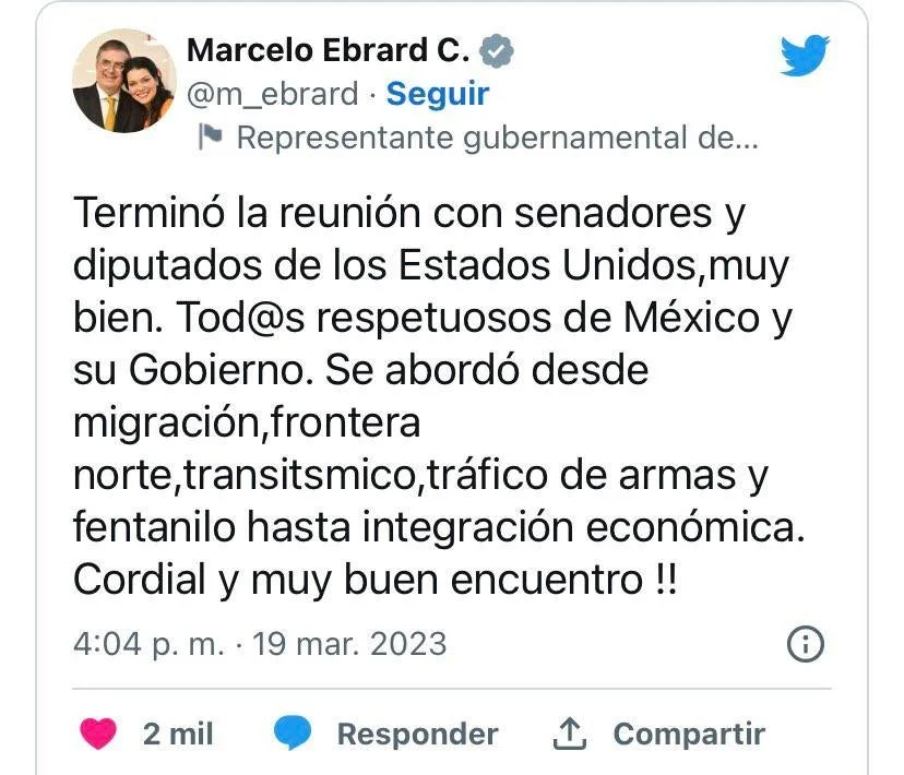 Al término de la reunión, el secretario de Relaciones Exteriores Marcelo Ebrard refirió: