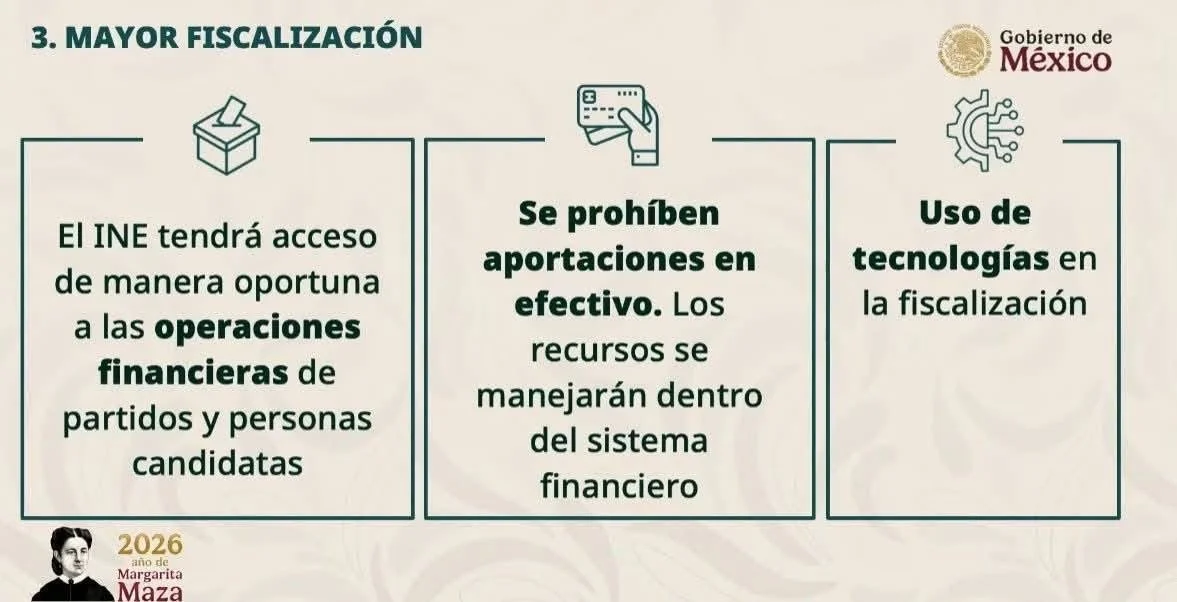 4. Mayor fiscalización: Se fortalecerá el control y supervisión de recursos de partidos y candidaturas, prohibiendo aportaciones en efectivo y promoviendo el uso de sistemas financieros transparentes.