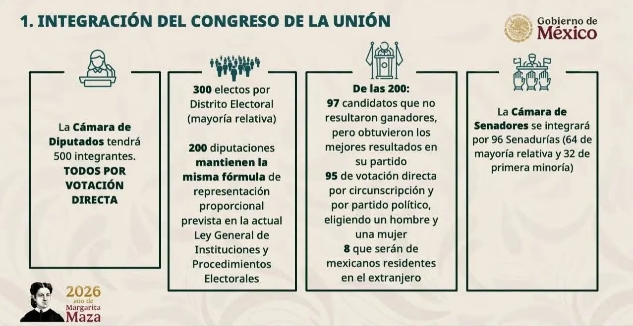 1. Integración de los cuerpos legislativos: La Cámara de Diputados mantendría 500 escaños, todos electos de forma directa, mientras que el Senado quedaría con 96 miembros, eliminando las listas plurinominales que actualmente se asignan por partido.