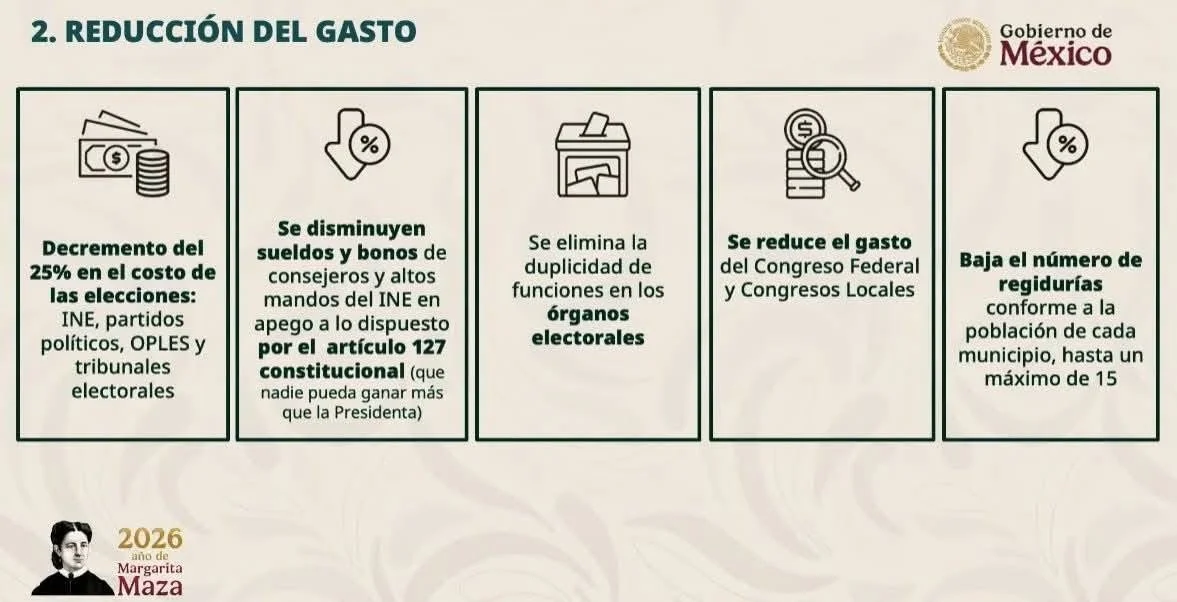 2. Reducción del gasto electoral: Se propone disminuir hasta un 25% el presupuesto total de las elecciones, mediante recortes a los recursos del Instituto Nacional Electoral (INE), partidos políticos, órganos locales y tribunales electorales.