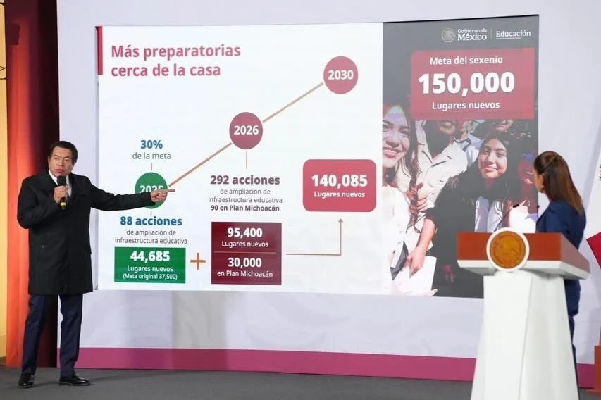 El Gobierno de México, a través de la Secretaría de Educación Pública (SEP), anunció que en 2026 se crearán 95 mil 400 nuevos lugares en Educación Media Superior a través de 292 acciones que contemplan la construcción de 20 Bachilleratos Tecnológicos cerca de la casa de los estudiantes, 52 ampliaciones, 130 nuevos Ciberbachilleratos, y en el marco del Plan Michoacán por la Paz y la Justicia, serán 10 Bachilleratos Tecnológicos, 20 ampliaciones y 60 Ciberbachilleratos.
