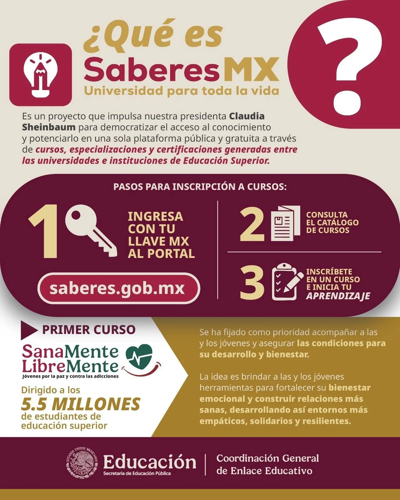 La presidenta Claudia Sheinbaum destacó la importancia que las instituciones públicas puedan difundir el conocimiento más allá de las aulas y puedan expandir su actuación a través de esta plataforma SaberesMX a fin de poner a disposición de la gente diversos tipos de cursos. Asimismo, se otorgarán certificaciones de las instituciones a las personas que hayan participado en estos cursos.