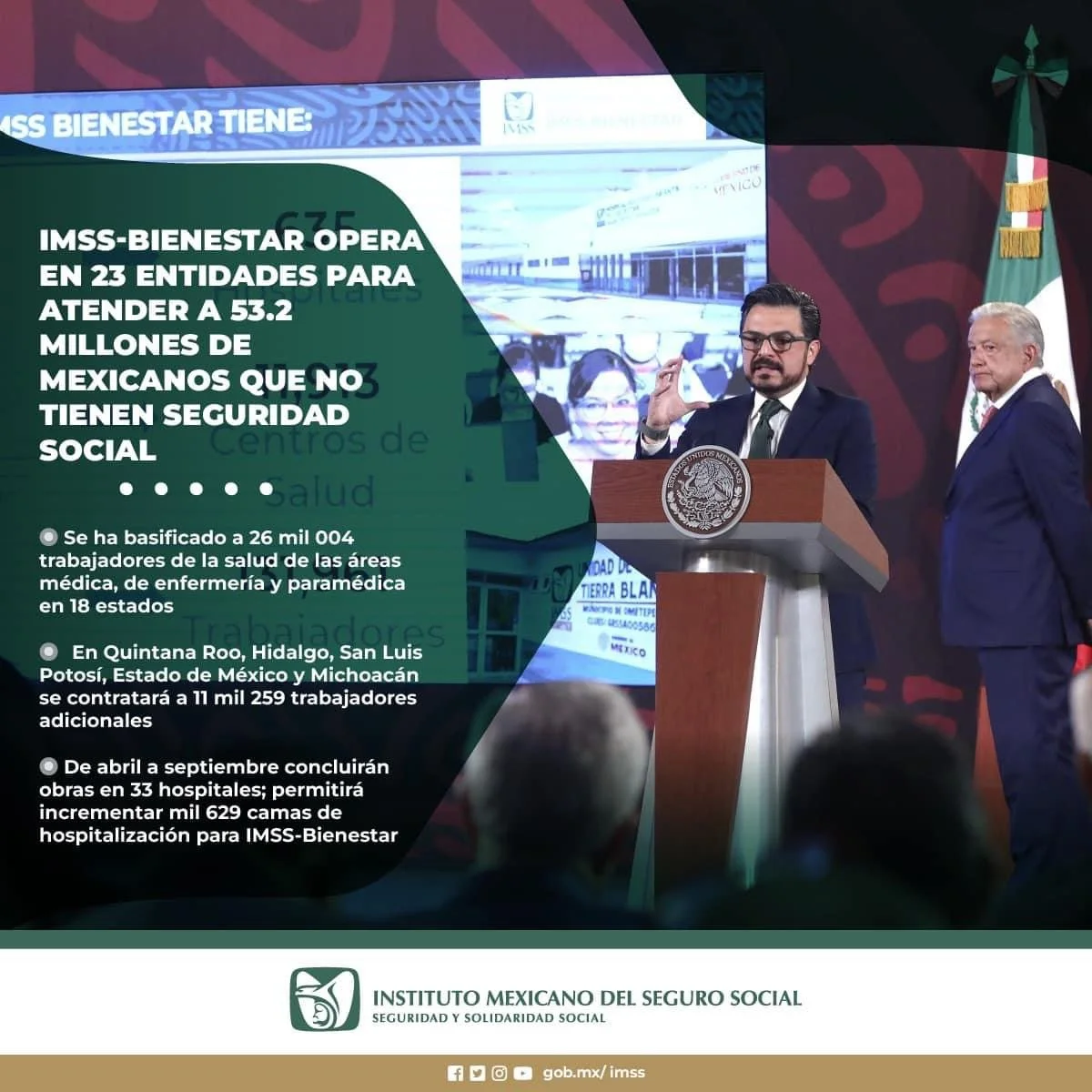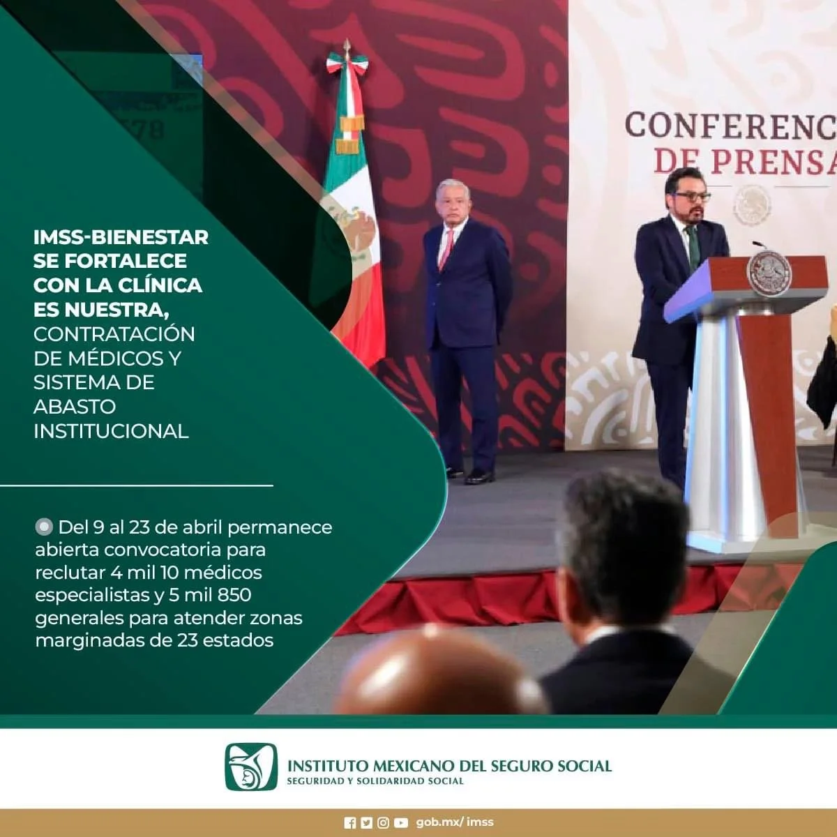 Durante la conferencia de prensa mañanera de hoy, Zoé Robledo Aburto, director general del Instituto Mexicano del Seguro Social (IMSS), presentó el programa “La clínica es nuestra”; así mismo, anunció la convocatoria para contratar 9,860 nuevos médicos especialistas y generales.