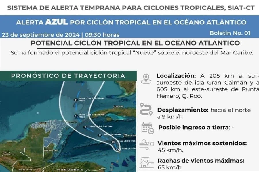 Se espera que el sistema se desplace hacia el noroeste acercándose a la costa norte de Quintana Roo como tormenta tropical o huracán categoría 1 en últimas horas de mañana martes o primeras del miércoles 25 de septiembre.