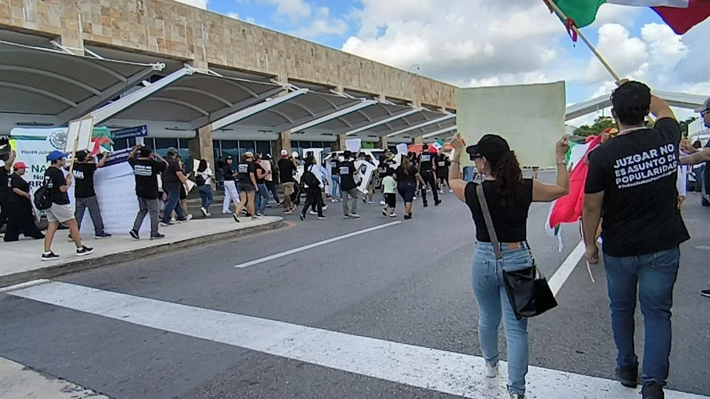 Un grupo de ciudadanos y trabajadores del Poder Judicial de la Federación (PJF) se manifestaron esta mañana en las inmediaciones de la terminal 3 del Aeropuerto Internacional de Cancún para expresar su oposición contra la reforma al Poder Judicial.