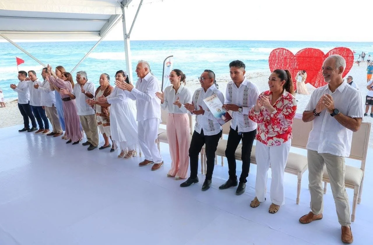 En un ambiente festivo frente al mar Caribe, 357 parejas contrajeron matrimonio civil durante las Bodas Colectivas 2026, celebradas en playa Delfines y atestiguadas por la gobernadora Mara Lezama Espinosa, la presidenta honoraria del DIF, Verónica Lezama Espinosa y la presidenta municipal Ana Paty Peralta.