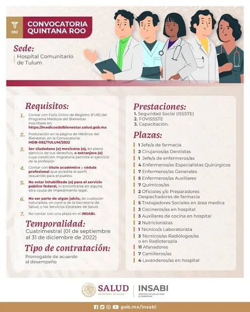 Es de recordarse que entre agosto y septiembre del 2022, el Instituto de Salud para el Bienestar (Insabi) contrató y capacitó a personal médico para cubrir 68 plazas: un jefe de farmacia, dos cirujanos dentistas; un jefe de enfermeros; cuatro enfermeros especialistas quirúrgicos, siete enfermeros generales; cinco enfermeros auxiliares; siete químicos; dos oficiales y/o preparadores despachadores de farmacia; y cinco trabajadores sociales en área médica.