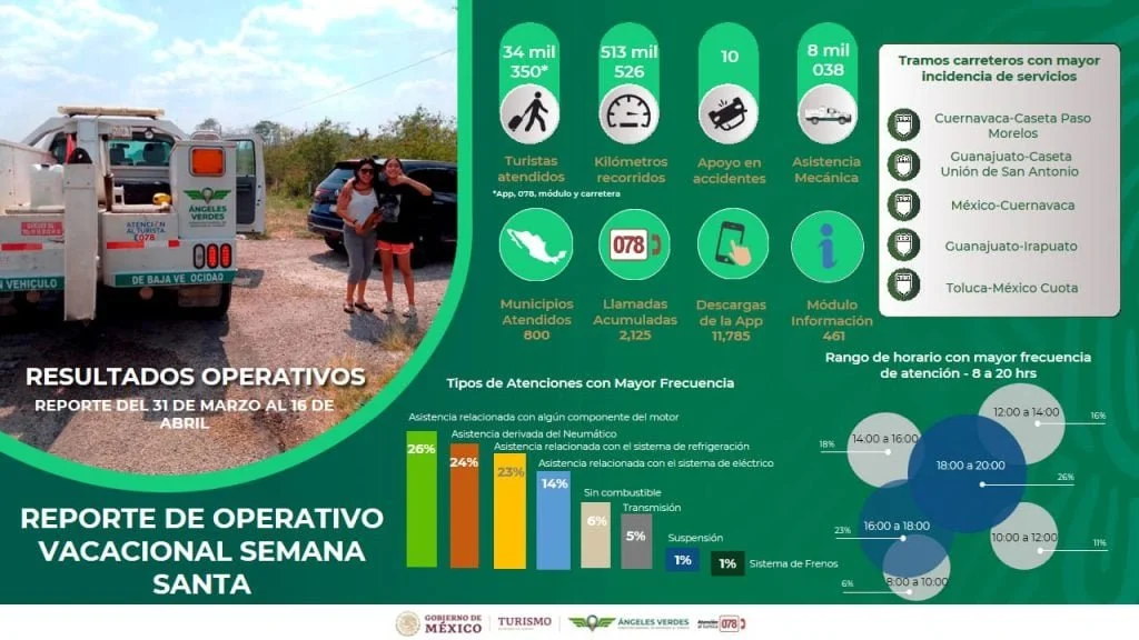 Como parte del Operativo Vacacional Semana Santa 2023 que concluyó el pasado 16 de abril, la Secretaría de Turismo federal, dio a conocer que 2 mil 125 llamadas al número gratuito 078 fueron atendidas; mientras que los Ángeles Verdes brindaron 8 mil 38 servicios de asistencia mecánica a lo largo de los 199 tramos carreteros de cobertura nacional; y que la app móvil registró 11 mil 785 descargas.