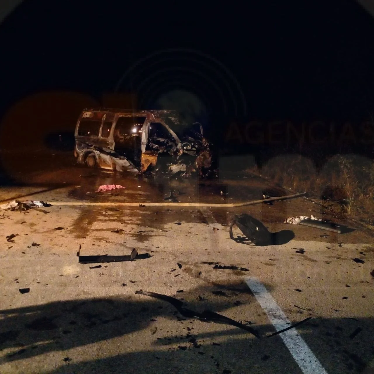 Fue cerca de las 4 de la mañana cuando esta van de transporte interurbano fue chocada de frente por un tráiler que se cruzó al carril contrario, a altura del entronque de la carretera federal con el acceso a X-Hazil Sur.