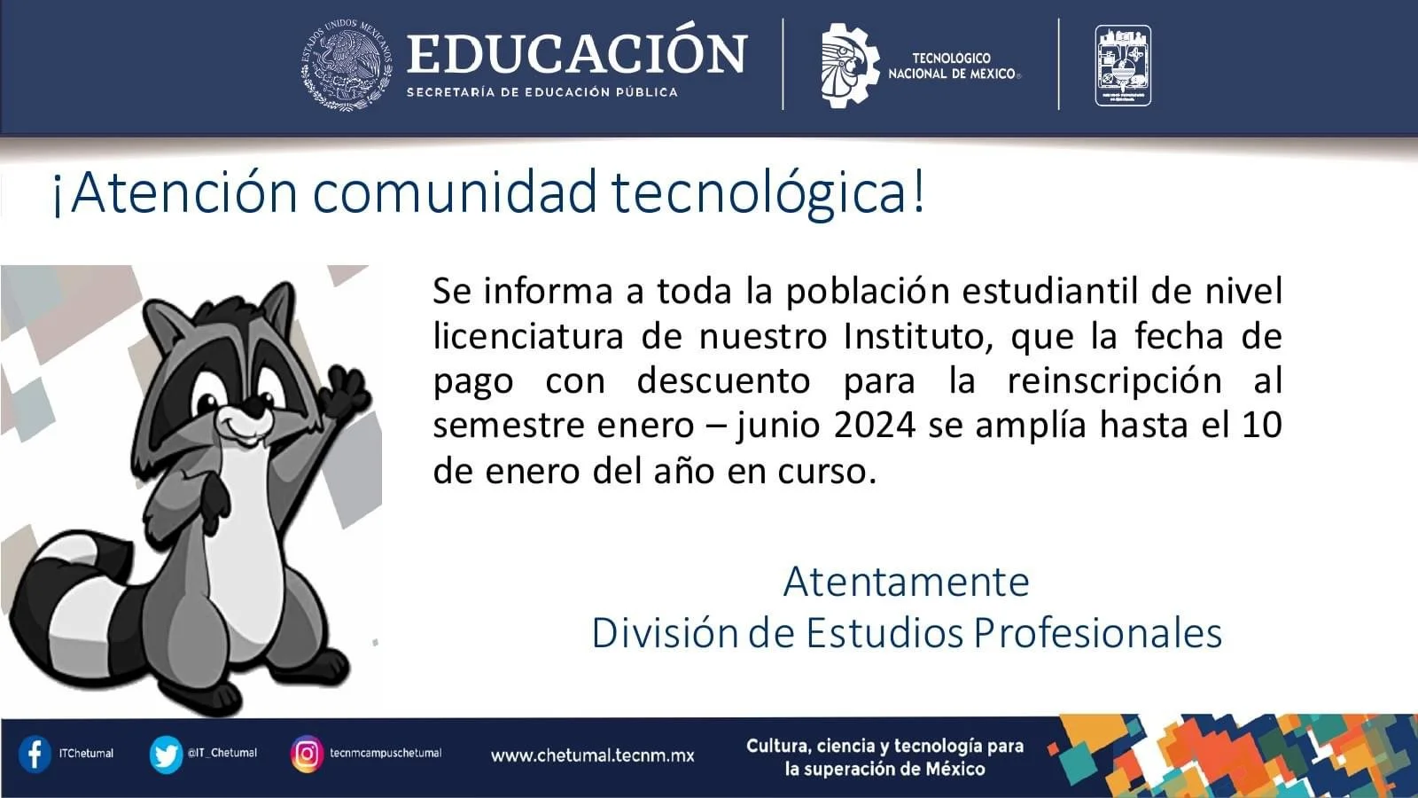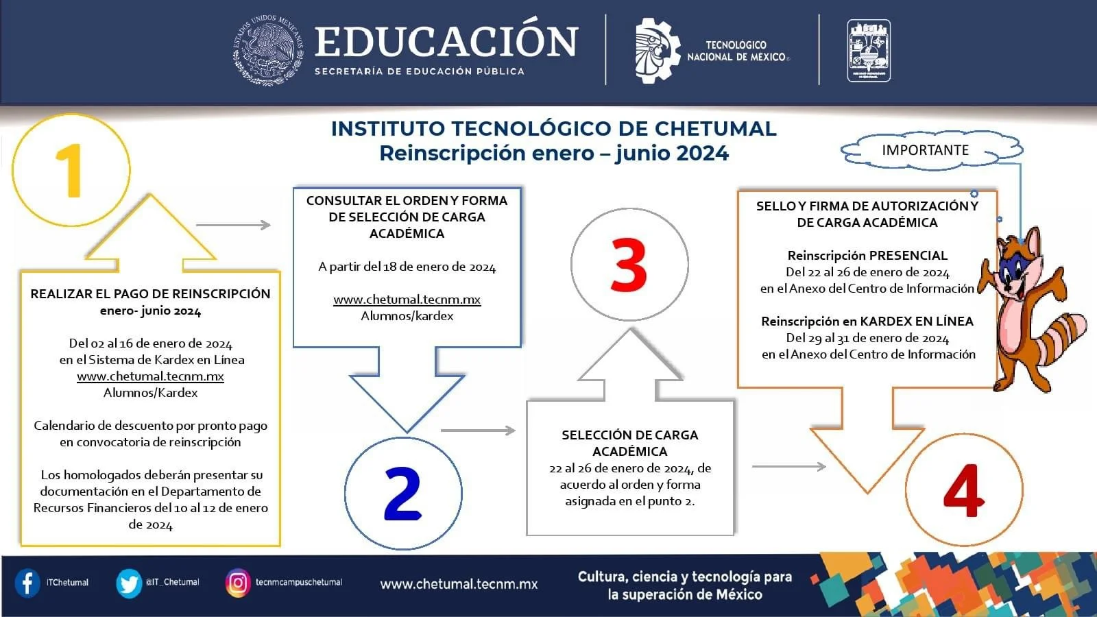 De acuerdo con la convocatoria emitida por el Instituto Tecnológico de Chetumal (Itch), el proceso de admisión de nuevo ingreso para el período escolar agosto-diciembre 2024, inició el pasado viernes 12 de enero y finalizará el lunes 4 de marzo de 2024.