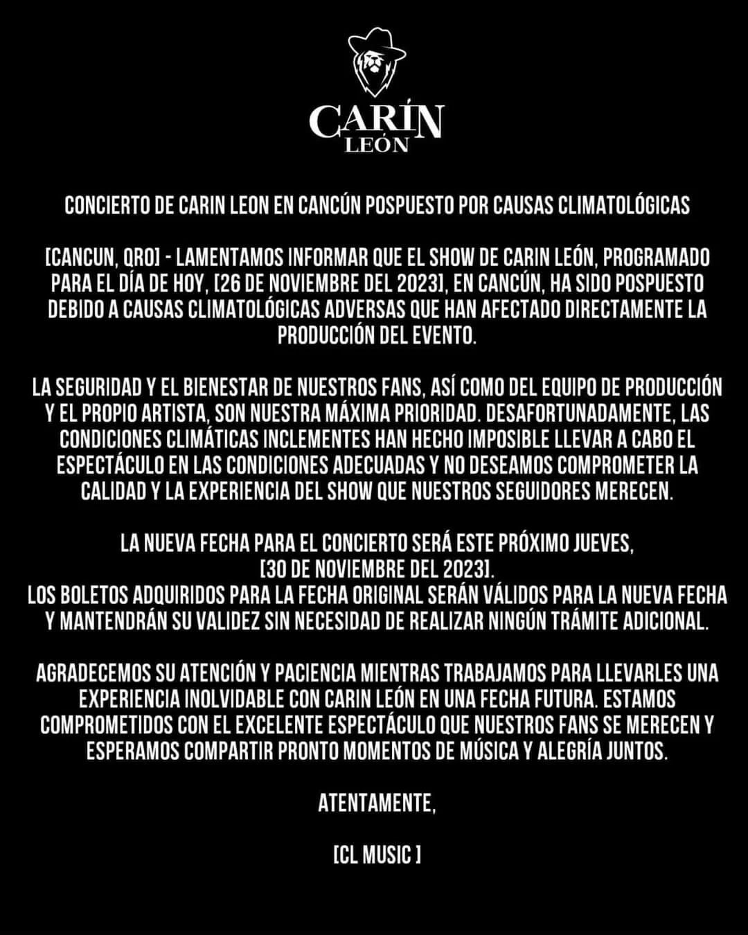 A unos metros de ahí, en el estadio Beto Ávila, filas de fans del cantante norteño Carín León esperaban el acceso a las instalaciones del estadio, en medio del fuerte aguacero. Sin embargo, luego de una hora, la empresa promotora decidió suspender el concierto y programarlo para el siguiente jueves, ya que al paracer se mojó el equipo de sonido.