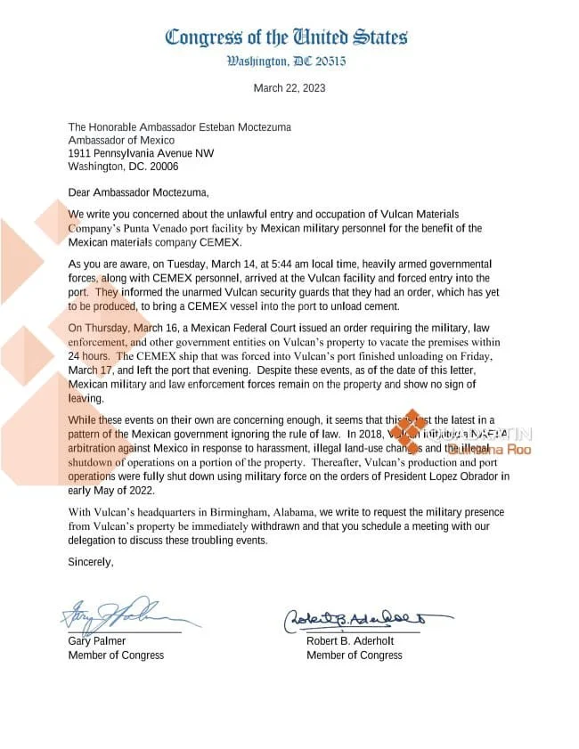 Siete congresistas estadounidenses y dos senadores enviaron este miércoles una carta firmada al embajador de México en Estados Unidos, Esteban Moctezuma, exigiéndo el retiro de las fuerzas militares que mantienen tomada la mina Sac-Tun así como el muelle de Punta Venado en Playa del Carmen, propiedad de Sac-Tun empresa filial de Vulcan Materials.
