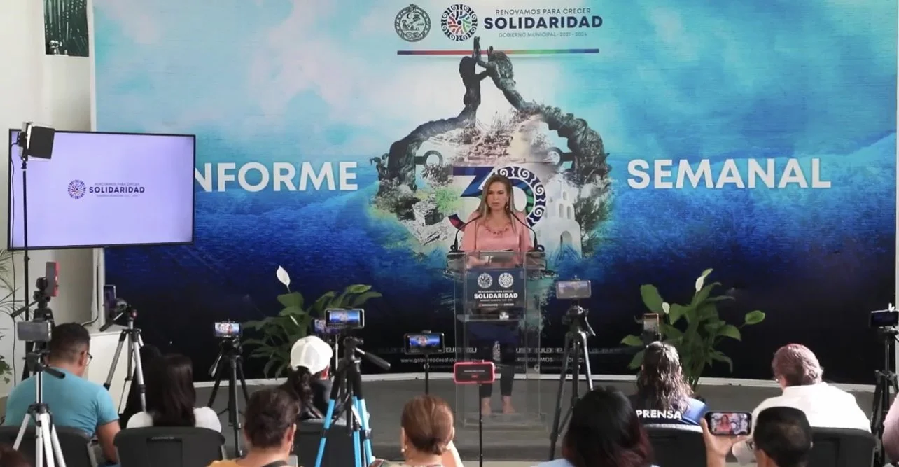 Durante su informe semanal, la presidente municipal de Solidaridad, Lili Campos, comunicó sobre la promoción del destino que realizarán en la Feria Internacional de Turismo (Fitur) en Madrid, España, así como la capacitación en Colombia de elementos policiales profesionales, quienes conforman el Grupo Especializado en Prevención y Combate a la Extorsión, el próximo Carnaval Playa del Carmen y descuentos en el pago del predial, entre otros temas.