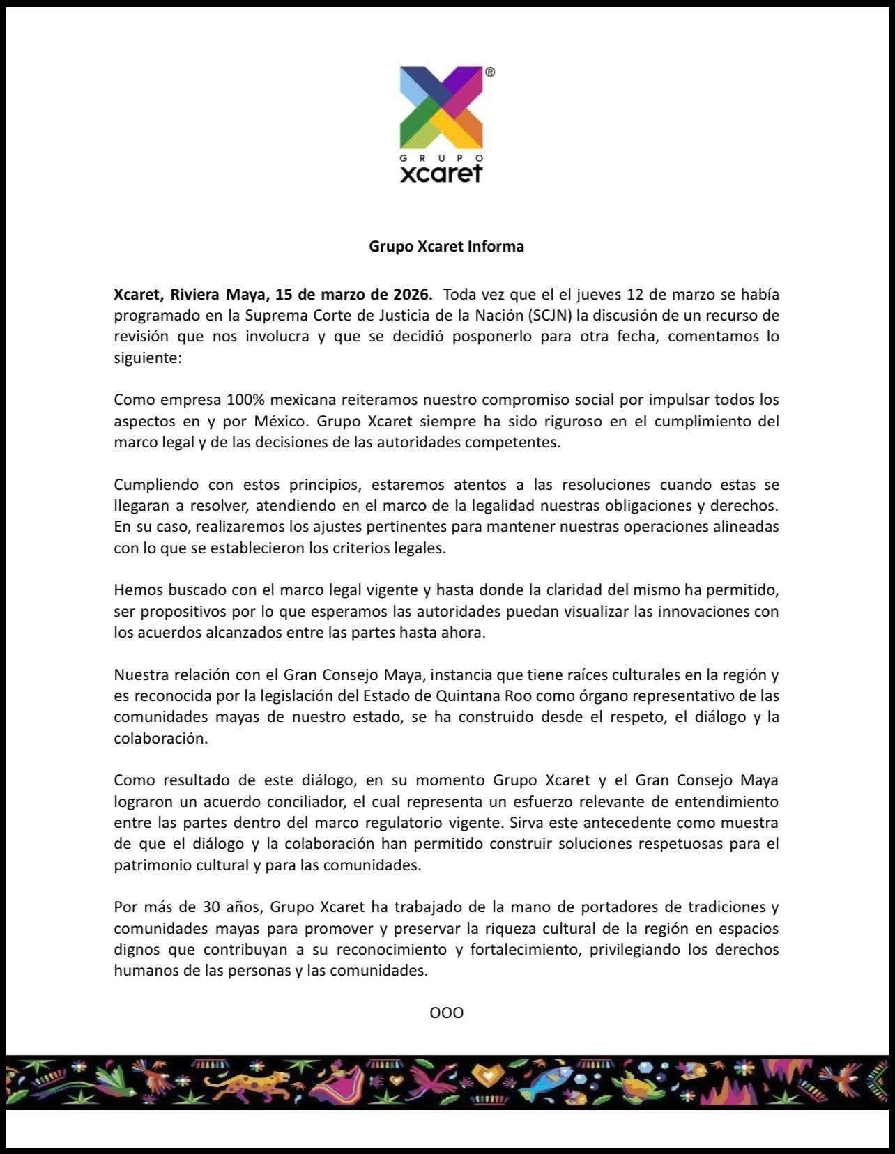 La Suprema Corte de Justicia de la Nación (SCJN) revocó este jueves la suspensión definitiva que permitía a Grupo Xcaret seguir utilizando elementos del patrimonio cultural maya en su publicidad turística, al considerar que la protección de este patrimonio tiene mayor peso que el interés comercial de una empresa privada. Con ello, la empresa deberá retirar dicha simbología de su publicidad mientras se resuelve el litigio de fondo.