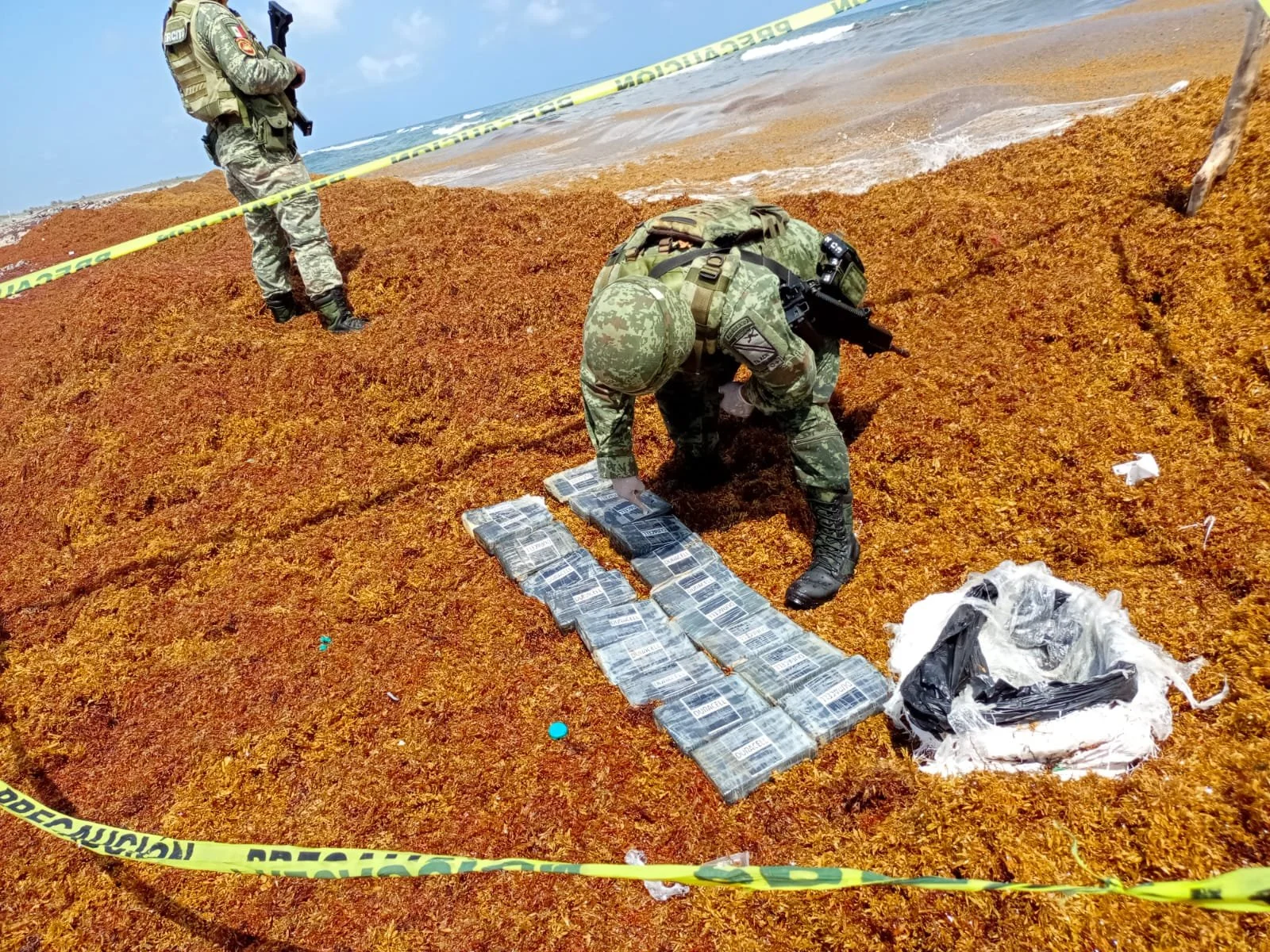 De acuerdo con las fuerzas castrenses, la droga asegurada y encontrada entre el sargazo, fue recuperada en áreas restringidas y de difícil acceso en la isla de Cozumel, durante patrullajes sobre la zona costera.