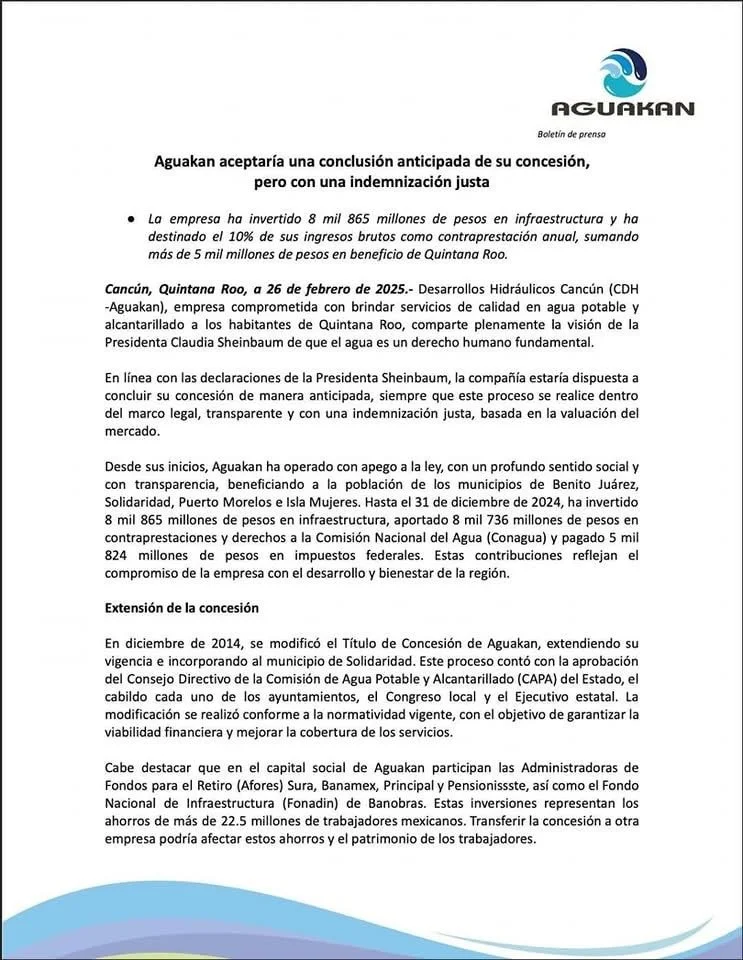 En relación al litigio que se está llevando a cabo en contra de la empresa de servicio de agua potable Aguakan, el gobierno del Estado, en voz de la secretaria de gobierno Cristina Torres, presentó su posicionamiento en el que resaltó los elementos que respaldan las denuncias contra la concesionaria, entre los que destacan la falta de distribución e incluso contaminación del agua potable.