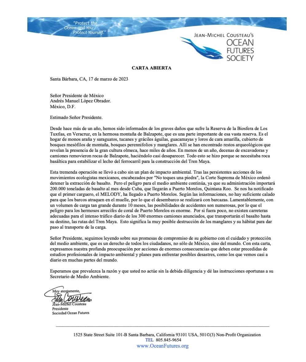 “Señor Presidente, seguimos leyendo sobre sus promesas de compromiso de su gobierno con el cuidado y protección del medio ambiente, que es un derecho de todos los ciudadanos, no solo de México, sino del mundo. Con esta carta, expresamos nuestra profunda preocupación por acciones de enormes consecuencias que deben estar precedidas de estudios profesionales de impacto ambiental y planes para enfrentar posibles desastres, como los que vemos casi a diarios en muchas partes del mundo. […] es mi deseo que prevalezca la razón y que usted no actúe sin la debida diligencia y dé las instrucciones oportunas a su secretario de Medio Ambiente.” indica la misiva.