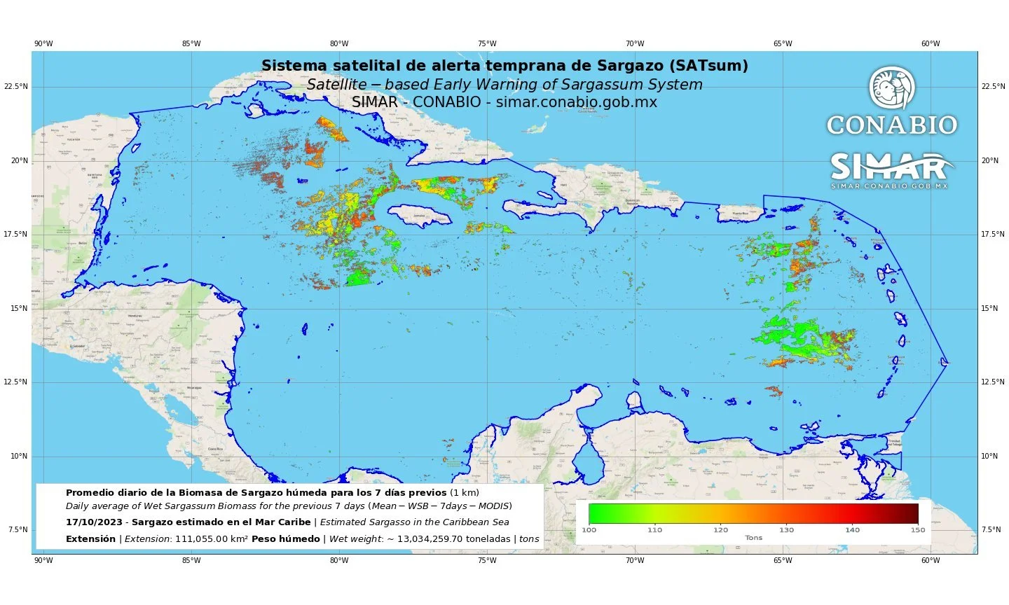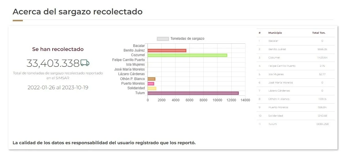 La Secretaría del Medio Ambiente y Recursos Naturales (Semarnat), a través del Sistema de Monitoreo de Sargazo Recolectado (Simsar), informó que hasta ayer, 18 de octubre, en Quintana Roo había sacado de las playas un total de 33 mil 403.338 toneladas de sargazo.