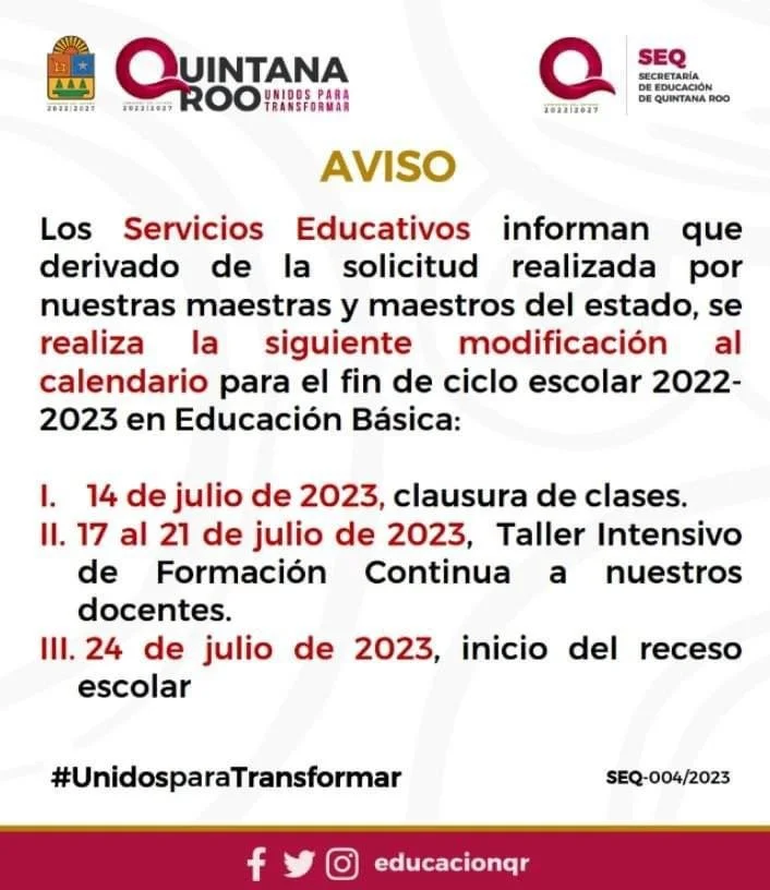 De acuerdo con el calendario oficial, la fecha fijada para la clausura de actividades era el próximo 19 de julio, sin embargo, la dependencia educativa anunció mediante un comunicado que las clases en preescolar, primaria y secundaria finalizarán el 14 de julio, cinco días antes de lo estipulado.