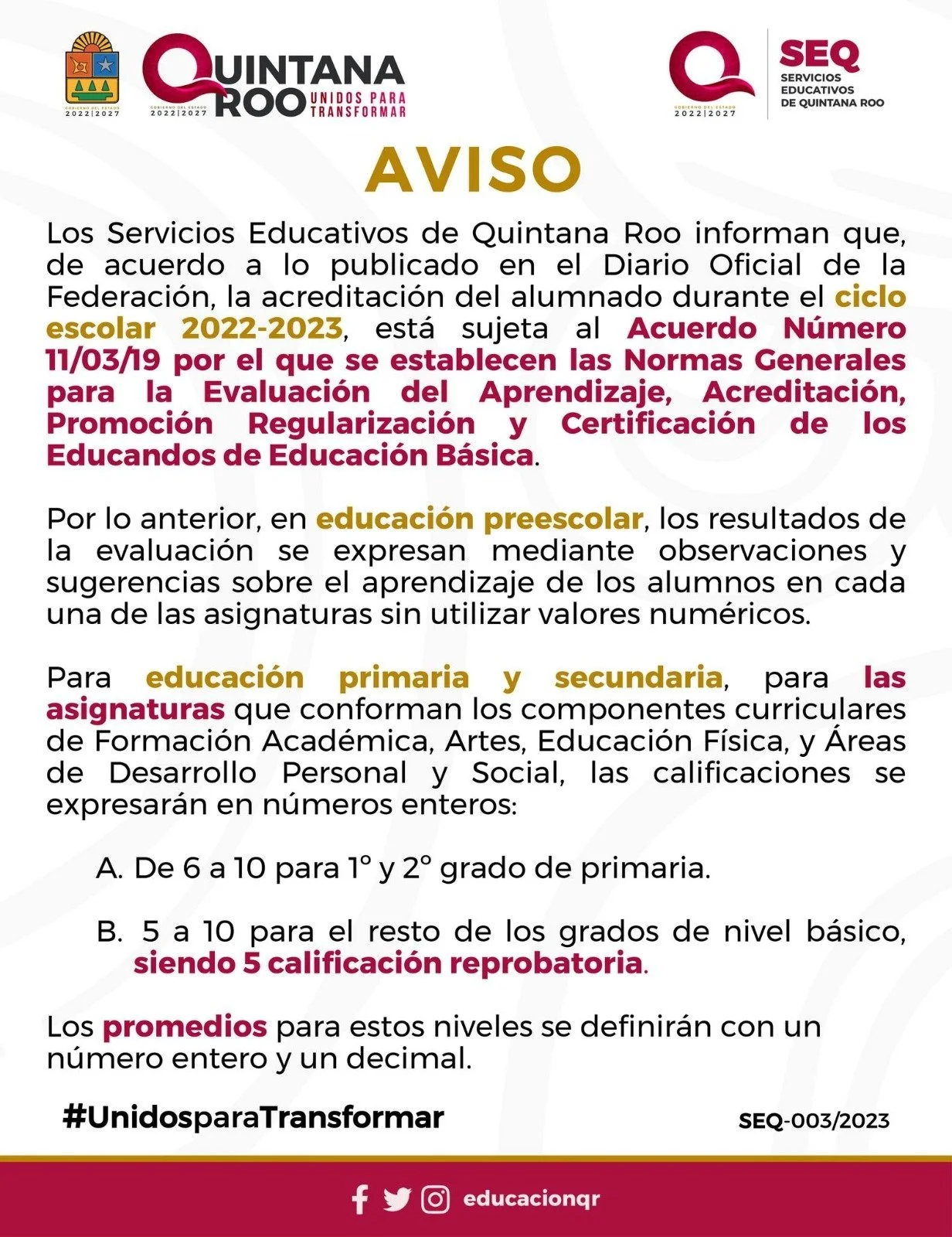 Otra modificación anunciada para este ciclo, es el regreso del sistema de calificación en el nivel básico, el cual marca que los alumnos de secundaria, así como del tercero al sexto grado de primaria, podrán obtener resultados reprobatorios, mientras que los estudiantes de primero y segundo de primaria, tendrán evaluaciones del 6 al 10.