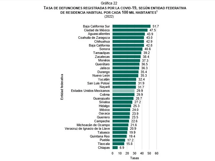 El Inegi precisó que el número de las defunciones registradas fue el menor desde 2019, pero aún se mantiene elevada; de estas defunciones, 43.7 por ciento correspondió a mujeres, y 56.2 por ciento a hombres y, en mil casos, no se especificó el sexo de la persona.