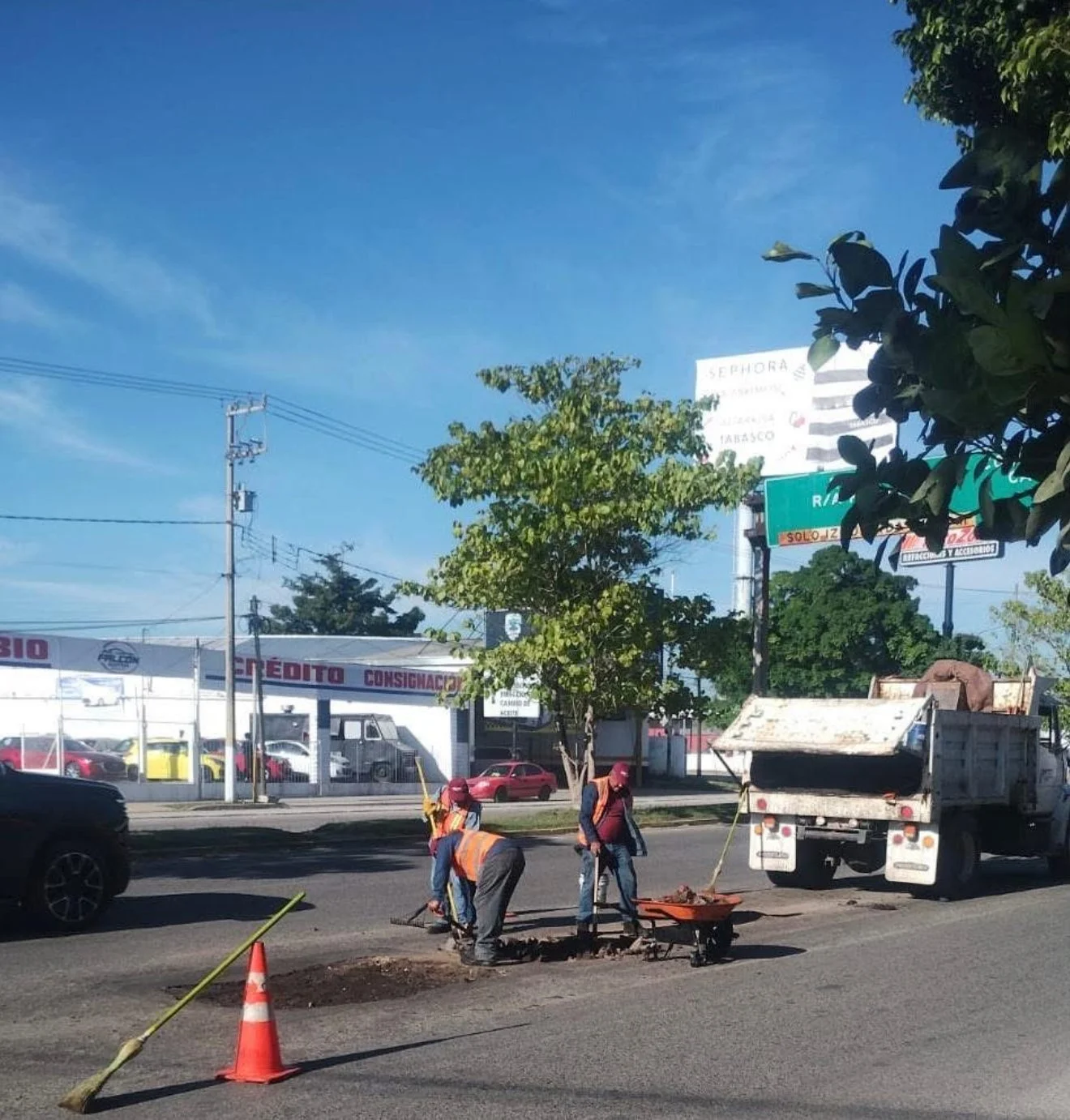 Los trabajos se concentran en el tramo que va de la avenida Gregorio Méndez a la calle Heroico Colegio Militar, en la colonia Atasta de Serra, donde cuadrillas municipales realizan labores de mantenimiento en puntos específicos de la carpeta asfáltica.