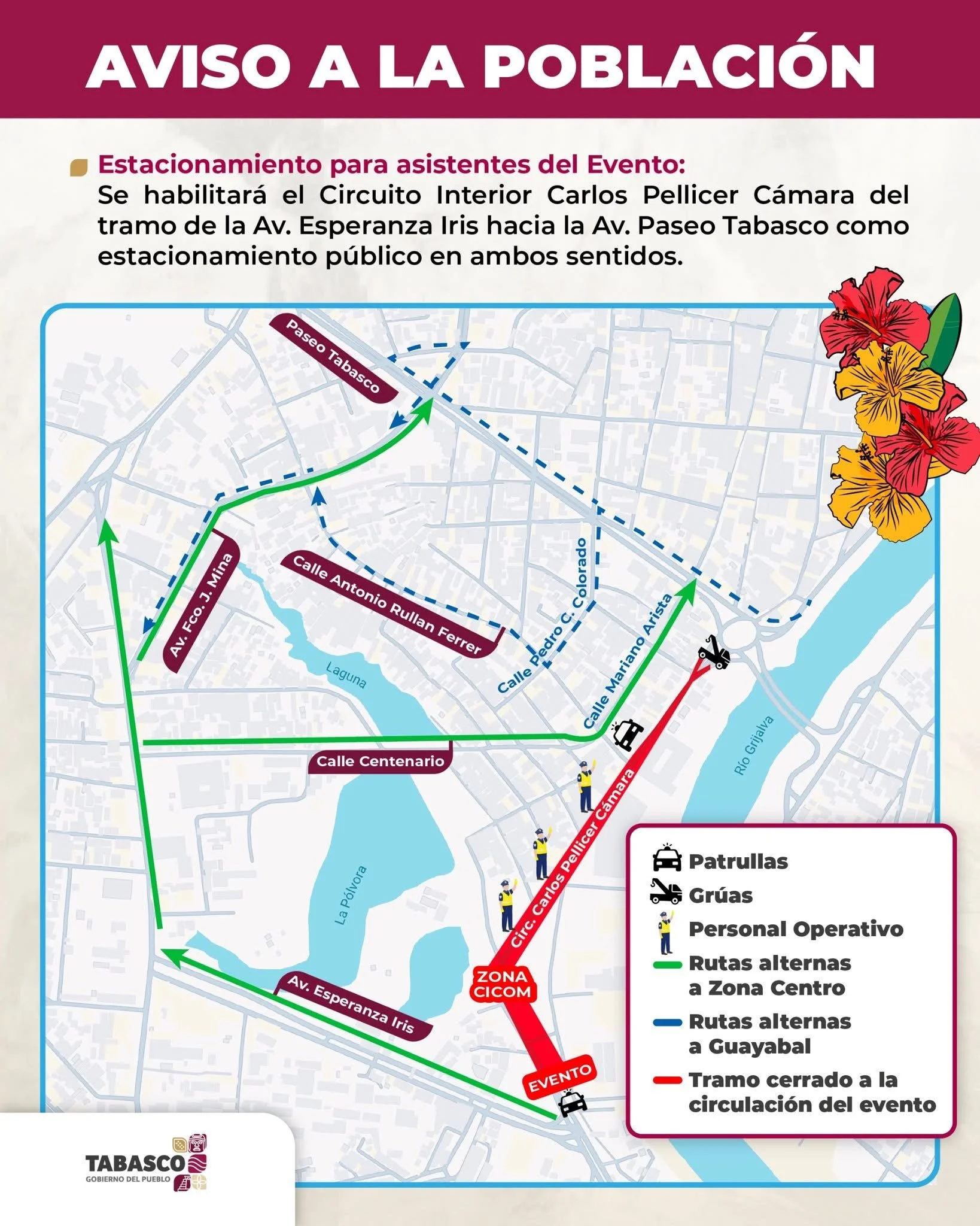 Durante el desarrollo de los eventos, se permitirá el uso temporal de ambos sentidos del Circuito Interior Carlos Pellicer Cámara, en el tramo de Esperanza Iris a Paseo Tabasco, como zona de estacionamiento público.