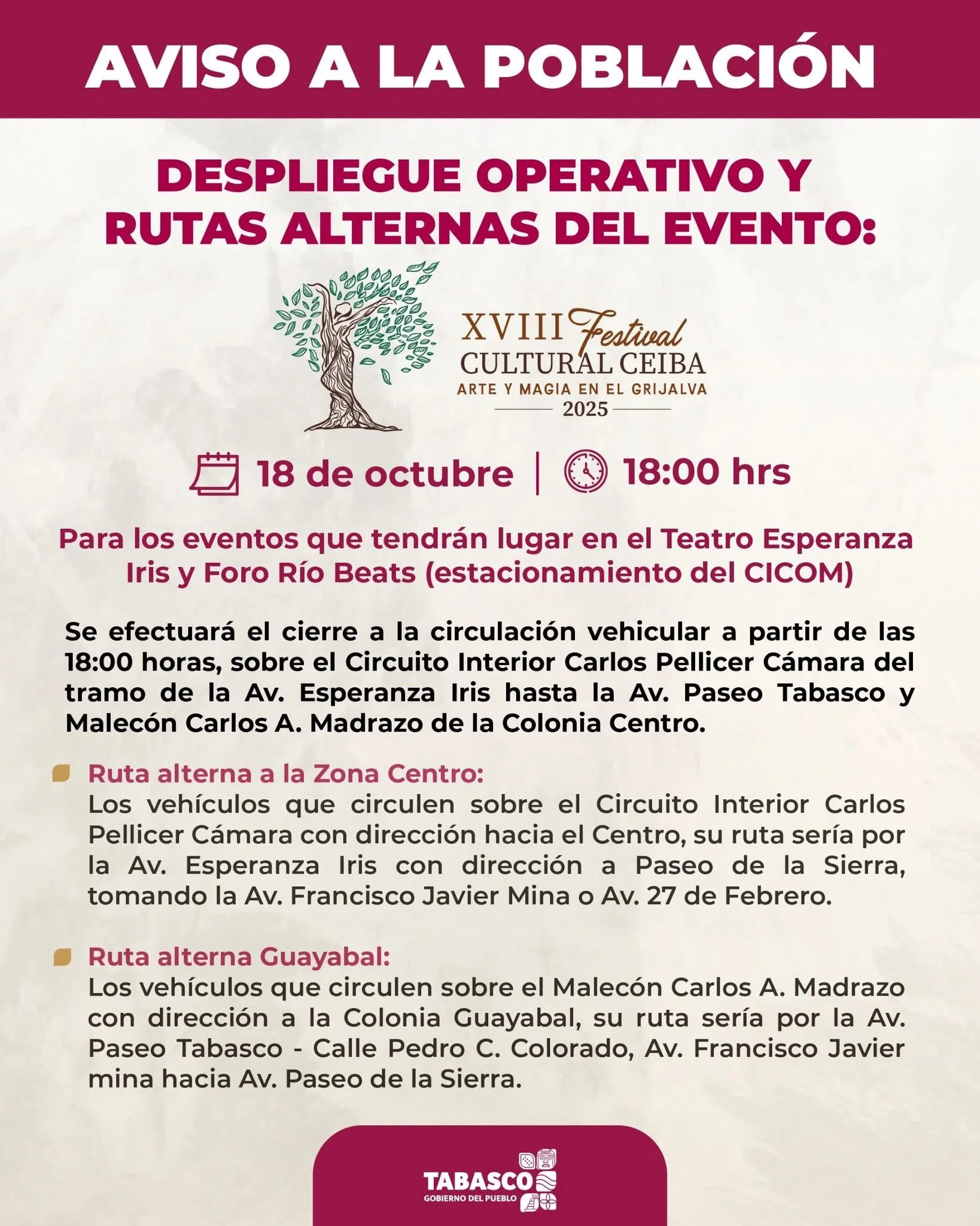 Con motivo de las actividades del Festival Cultural Ceiba 2025, la Secretaría de Cultura del Estado informó que este viernes 18 de octubre, a partir de las 18:00 horas, se realizará un cierre temporal a la circulación vehicular en el Circuito Interior Carlos Pellicer Cámara.