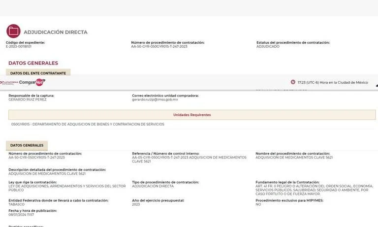 De acuerdo con información pública en la plataforma Compranet, a través de adjudicaciones directas, el IMSS ha entregado un total de 99 millones 054 mil 245.38 pesos a las empresas Roana Farma S.A de C.V, y Grupo Rapharma S.A de C.V, cuyo apoderado legal responde al nombre de Rodrigo Ramírez.
