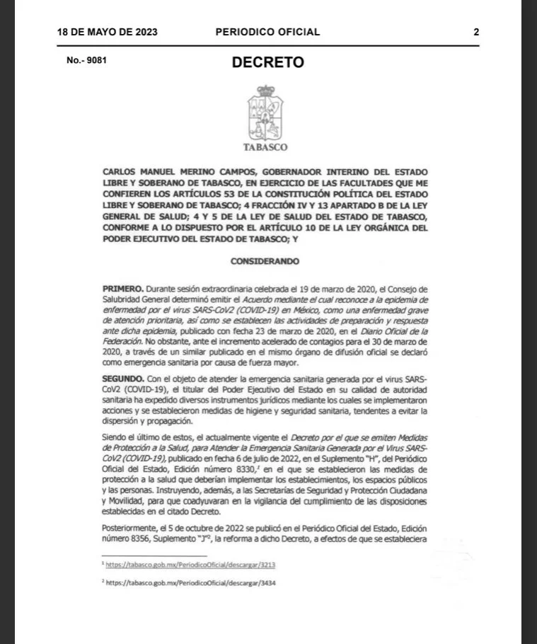 El Diario Oficial de la Federación publicó nuevo Decreto por el cual se levanta la emergencia de salud en Tabasco generada por el Virus SARS-CoV2 (COVID-19).