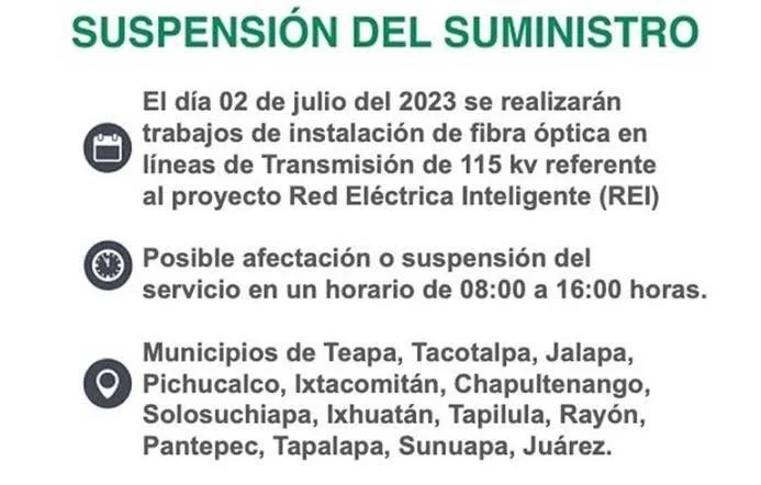 Habrá cortes de luz este domingo 2 de julio en municipios de Tabasco y Chiapas
