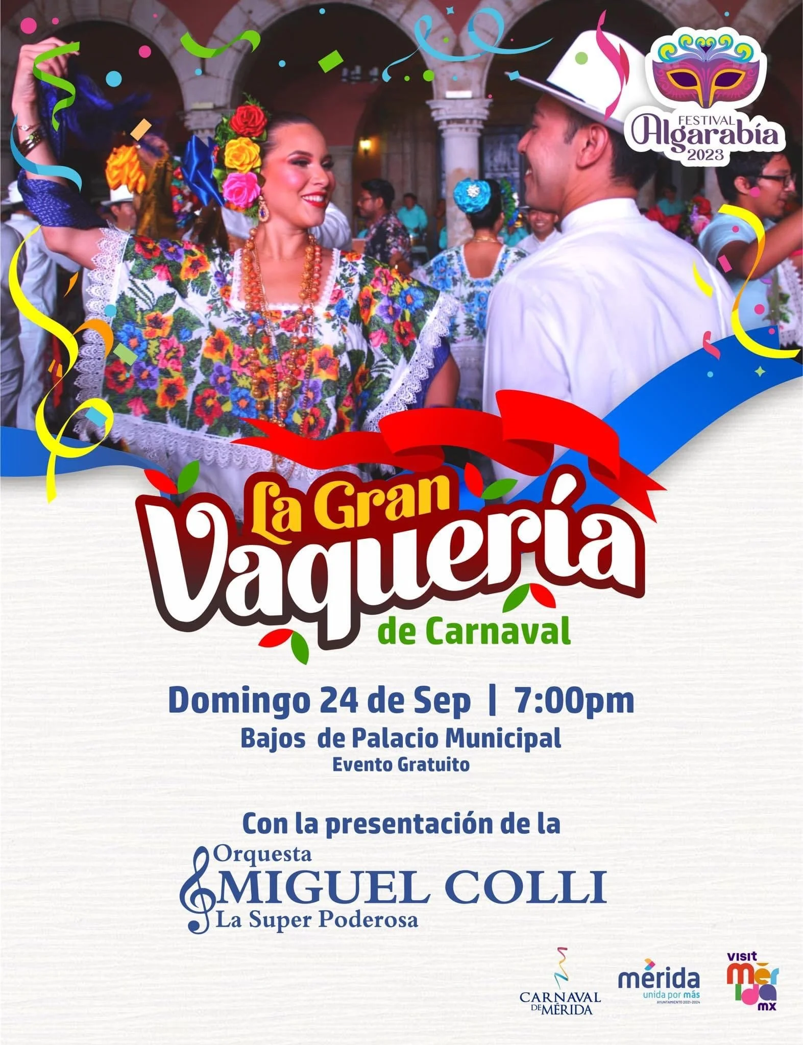 Mientras este domingo 24 de septiembre, a las 7:00 de la noche, se efectuará una Gran Vaquería y la presentación de la Orquesta Miguel Collí la Súper Poderosa, en los bajos del Palacio Municipal de Mérida.