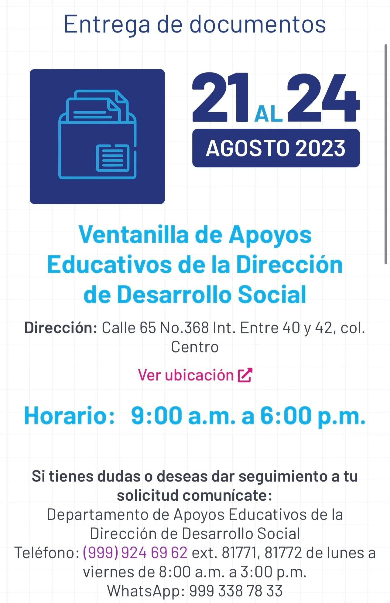 Las y los interesados tienen del lunes 21 al jueves 24 de agosto para presentar sus documentos en la Ventanilla de Apoyos Educativos de la Dirección de Desarrollo Social del Ayuntamiento de Mérida, ubicada en la calle 65 número 368 entre 40 y 42 de la colonia Centro, en un horario de 9:00 am a 6:00 pm.