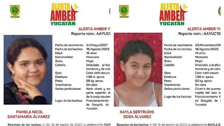 Ellas son Pamela Nicol Santamaría Álvarez y Kayla Gertrudis Sosa Álvarez, de 16 y 13 años de edad, respectivamente, quienes fueron vistas por última vez en el fraccionamiento Bosques de Dzoyolá, en Kanasín, sin que hasta ahora se sepa de su paradero.
