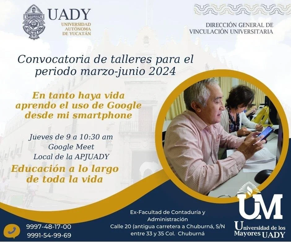 La Universidad de los Mayores de la Universidad Autónoma de Yucatán (UM-UADY), dio inicio a la Convocatoria de inscripción para los más de 20 talleres que se ofrecerán en el periodo marzo-junio 2024.