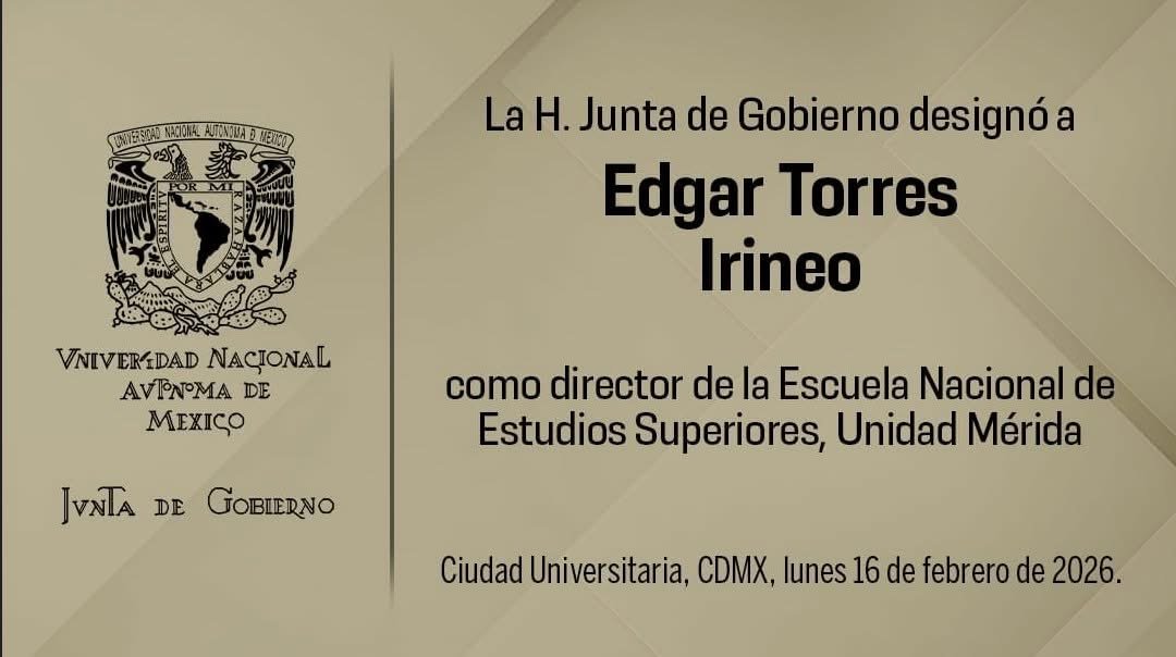 Este martes, la Junta de Gobierno de la UNAM anunció que Edgar Torres Irineo fue designado como el nuevo director de la Escuela Nacional de Estudios Superiores (ENES), Unidad Mérida, para el periodo 2026-2030.